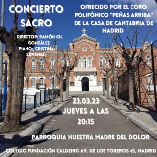 El Coro Polifónico «Peñas Arriba» de la Casa de Cantabria en Madrid os invita a su próximo concierto el 23 de marzo en la Parroquia Nuestra Madre del Dolor