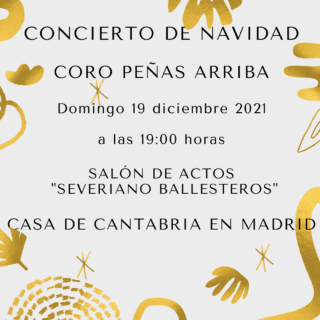 El domingo 19 de diciembre de 2021, a las 19:00 horas, en el salón de actos Severiano Ballesteros de la Casa de Cantabria en Madrid, el Coro Polifónico Peñas Arriba de la Casa de Cantabria en Madrid ofrecerá su tradicional concierto de Navidad en un formato escénico pensado para toda la familia. Acompañarán al coro La Marmota Devota (voz y guitarra), Marina Martínez (piano) y Víctor Sevilla (instrumentos), todos ellos dirigidos por Ramón Gil. Aforo limitado.