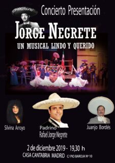 El lunes 2 de Diciembre a las 19:30 horas, en el Salón de Actos Severiano Ballesteros, Silvia Arroyo, Rafael Jorge Negrete y Juanjo Bordés, nos ofrecerán el concierto presentación “Jorge Negrete. Un musical lindo y querido”.