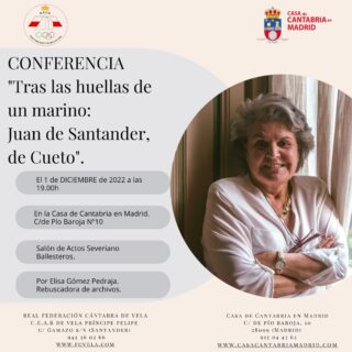 El próximo jueves, 1 de Diciembre en el Salón de Actos Severiano Ballesteros de la Casa de Cantabria en Madrid a las 19:00 horas, tendrá lugar la conferencia “ Tras las huellas de un marino: Juan de Santander de Cueto” impartida por Elisa Gómez Pedraja. Les esperamos a todos en esta maravillosa conferencia. La conferencia se ha aplazado al 16 de febrero de 2023.