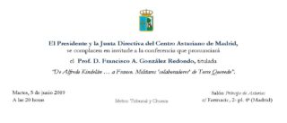 El próximo miércoles 5 de junio a las 20:00 horas en el Centro Asturiano de Madrid (calle Farmacia nº 2, planta 4ª) el Profesor D. Francisco A. González Redondo impartirá la conferencia cántabro-asturiana titulada “De Alfredo Kindelán …a Franco. Militares “colaboradores” de Torre Quevedo”