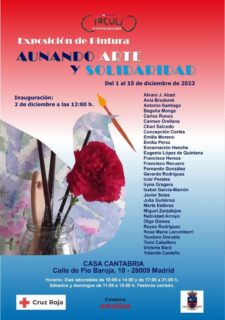 Del 1 al 15 de Diciembre la Sala de exposiciones Gutiérrez Solana, hall de la Casa de Cantabria en Madrid, acogerá la exposición colectiva “ AUNANDO ARTE Y SOLIDARIDAD” de tema libre compuesta por 33 artistas pertenecientes al Círculo de Pintores Solidarios.