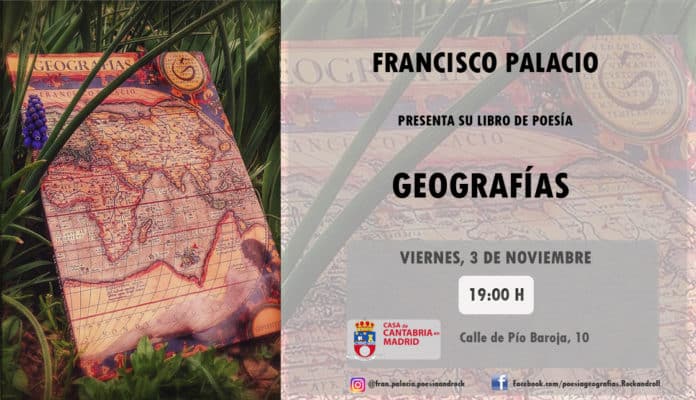 El viernes 3 de noviembre a las 19:00 horas, en el Salón de Actos Severiano Ballesteros, el escritor cántabro, D. Fran Palacio Cabrero, realizará la presentación de su libro “Geografías” (Editorial Septentrión). D. Fran Palacio es finalista en el año 2015 por su poemario “Blues del oficinista” en el blog «Por amor al arte», y en el año 2016, un microrrelato suyo fue elegido por la Editorial Liceus para su edición «El amor y sus máscaras». Fue ganador en el concurso popular de Haikus de la Librería Gil.
