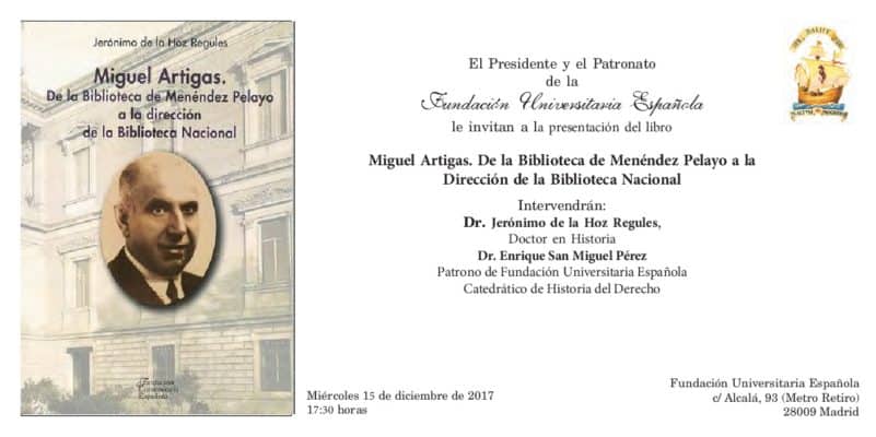 Sobre la figura de Miguel Artigas, quien fue durante 15 años primer director de la santanderina Biblioteca de Menéndez Pelayo, y artífice de los Cursos de Verano y del Colegio Universitario, que dío lugar a la actual UIMP, se acaba de escribir una biografía que será presentada en la Fundación Universitaria Española (Calle Alcalá 93. Madrid ) el próximo 15 de diciembre a las 17:30 horas.