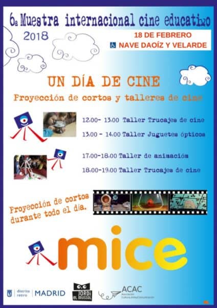 Os invitamos a participar este domingo 18 de febrero en la 6ª Muestra de Cine Internacional Educativo, MICE, en la Nave Daoíz y Velarde en la que se proyectarán a partir de las 12h, cortometrajes realizados por menores de 12 años y de carácter educativo realizados por profesionales. Consideramos que es una actividad interesante puesto que paralelamente se realizarán talleres sobre trucajes de cine, de animación y juguetes ópticos orientados a la educación audiovisual en los que se enseñarán las claves y competencias básicas frente al bombardeo de mensajes que recibimos diariamente, además de aportar información sobre la cultura de la imagen.