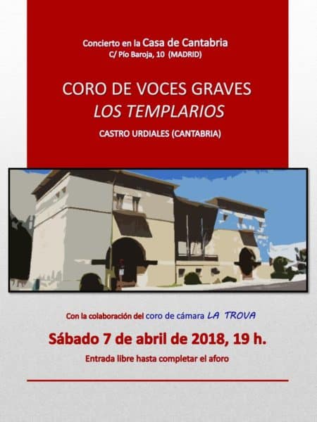 El sábado 7 de abril a las 19:00 horas, en el Salón de Actos Severiano Ballesteros, la Casa de Cantabria en Madrid acoge al Coro de Voces Graves “Los Templarios”, de Castro Urdiales, quienes ofrecerán un concierto titulado “Castro Urdiales canta en Madrid”, dirigidos por D. Jose Luis Sáez. El Coro de Cámara “La Trova”, bajo la dirección de Doña María José Álvarez Borondo, y como organizadores del encuentro coral, iniciarán el concierto con varias canciones de su repertorio.