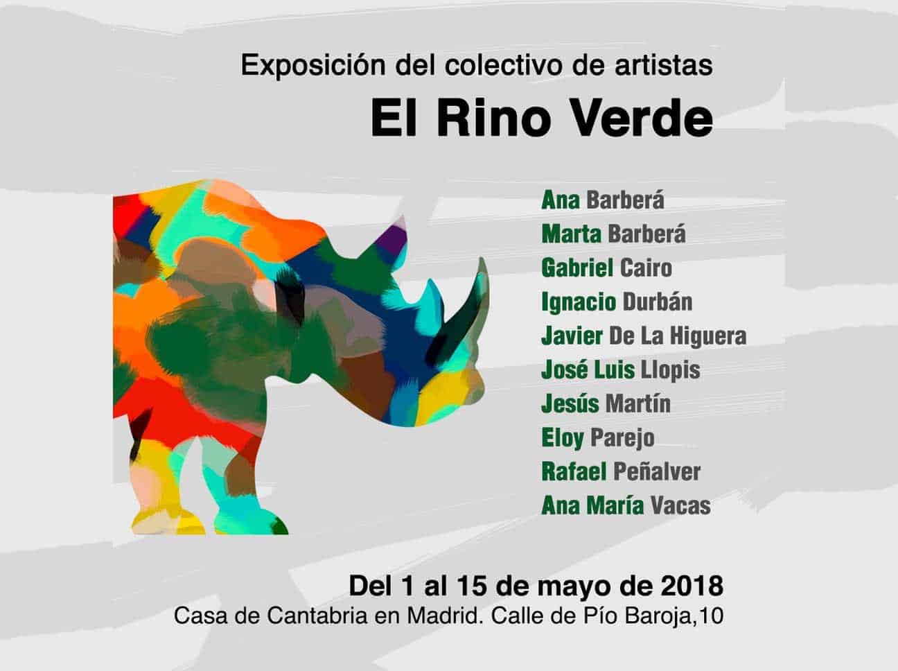 El miércoles, 2 de mayo, a las 19:00 horas, la Sala de Exposiciones Gutiérrez Solana, hall, acogerá la inauguración de la exposición de pintura del colectivo de artistas “El Rino Verde”: Ana Barberá, Marta Barberá, Gabriel Cairo, Ignacio Durbán, Javier de la Higuera, Jose Luis Llopis, Jesús Martín, Eloy Parejo, Rafael Peñalver y Ana María Vacas.