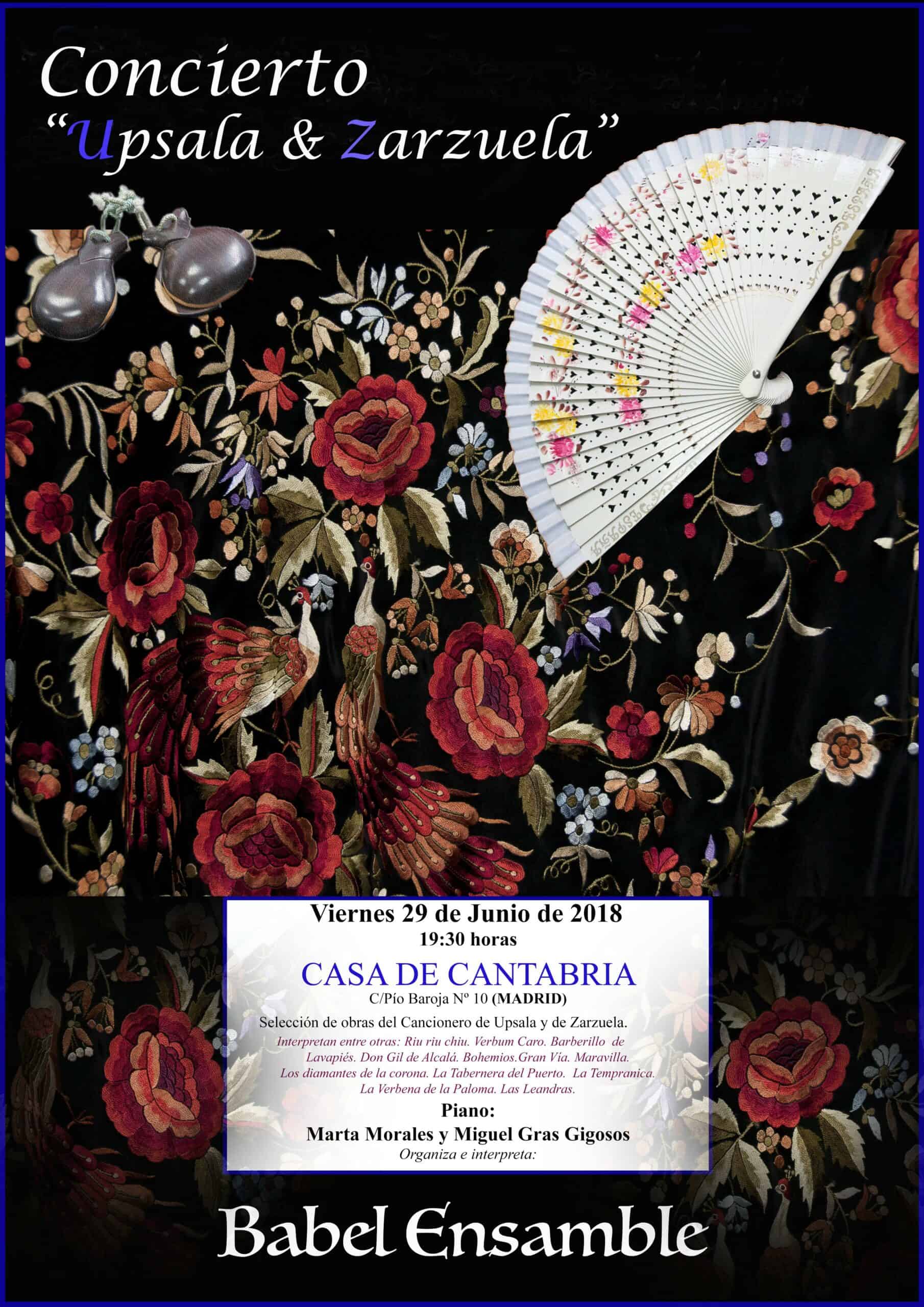 El próximo 29 de junio a las 19:30 horas, en el Salón de Actos Severiano Ballesteros, Babel Ensamble presenta concierto “Upsala y Zarzuela”. Interpretarán entre otras obras: Riuriuchiu, Verbum Caro, Barberillo de Lavapiés, Don gil de Alcalá, Bohemios, Gran Vía, Maravilla, Los diamantes de la Corona, La Tabernera del Puerto, La Tempranica, La Verbena de la Paloma y las Leandras. Se contará al piano con Marta Morales y Miguel Gras Gigosos.