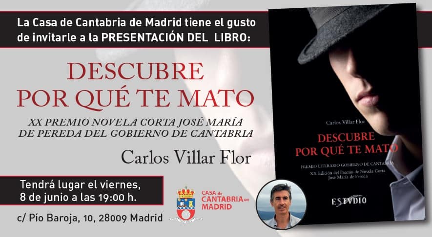 El próximo 8 de junio a las 19:00 horas, en el Salón de Actos Severiano Ballesteros. En la Casa de Cantabria en Madrid, se hará el acto de presentación en Madrid de la novela “Descubre por qué te mato”, del cántabro Carlos Villar Flor,un thriller que gira en torno a la amenaza de muerte que recibe un jefe de sección de un periódico regional. La obra fue galardonada con el “XX premio de novela corta José María de Pereda”, concedido por el Gobierno de Cantabria.