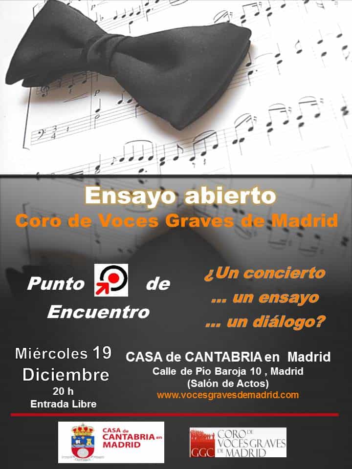 Este miércoles 19 de diciembre a las 20:00 horas en la Casa de Cantabria en Madrid en el Salón de Actos Severiano Ballesteros, el coro de Voces Graves de Madrid, dirigidos por Juan Pablo de Juan, realizará un ensayo-concierto abierto al público.