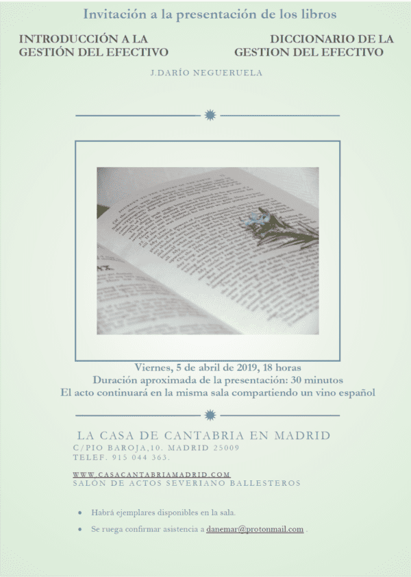 El próximo 5 de abril de 2019 a las 18:00 horas, en el Salón de Actos Severiano Ballesteros, la Casa de Cantabria en Madrid acoge la presentación de los libros “Introducción a la Gestión del Efectivo. Billetes, monedas y técnicas de impresión” y “Diccionario de la Gestión del Efectivo. Dinero y Bancos Centrales” escritos por D. J. Darío Negueruela, Economista Titulado del Banco de España, exprofesor de la UNED, y experto en la materia con experiencia laboral en diversas instituciones financieras tanto públicas como privadas.