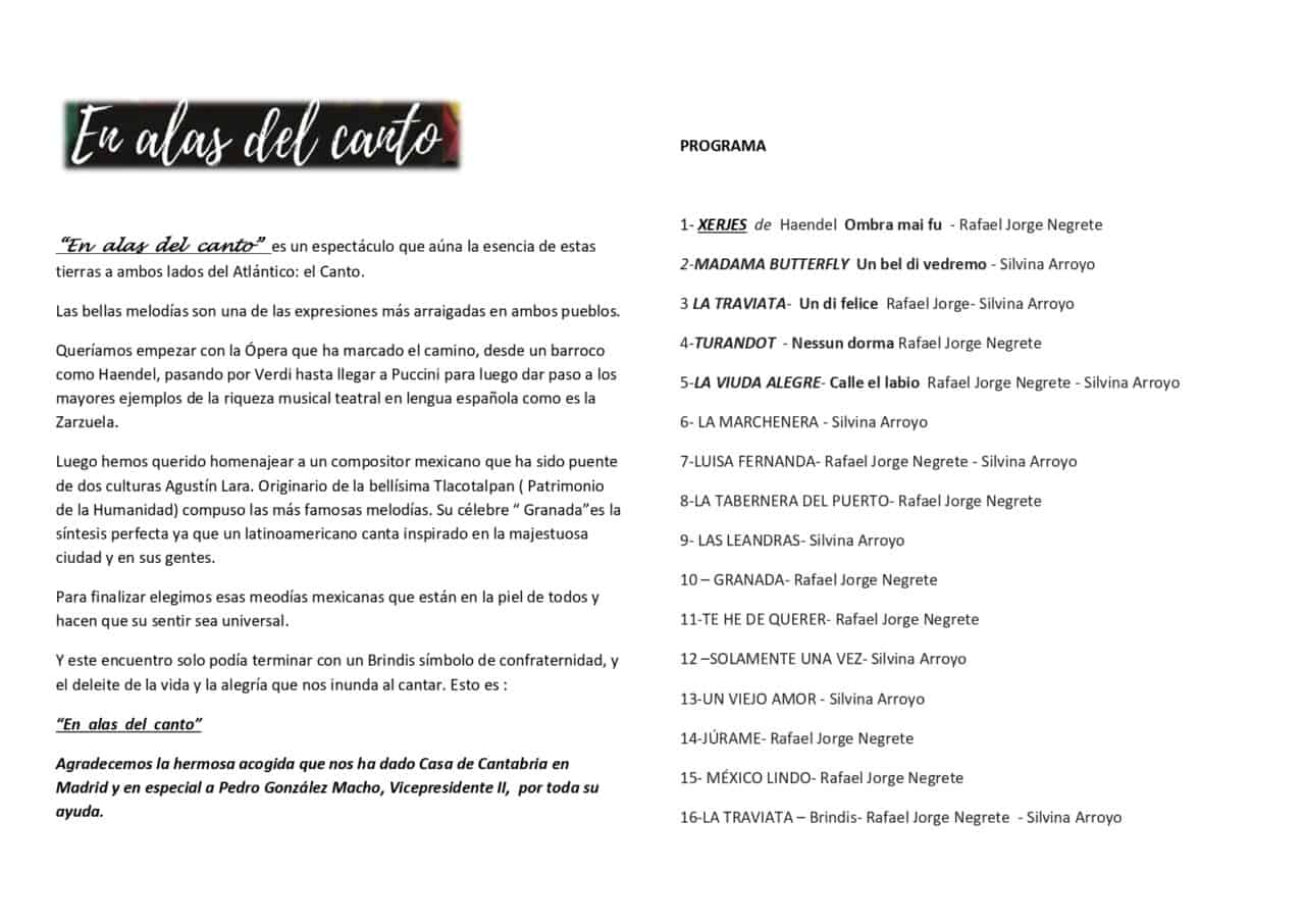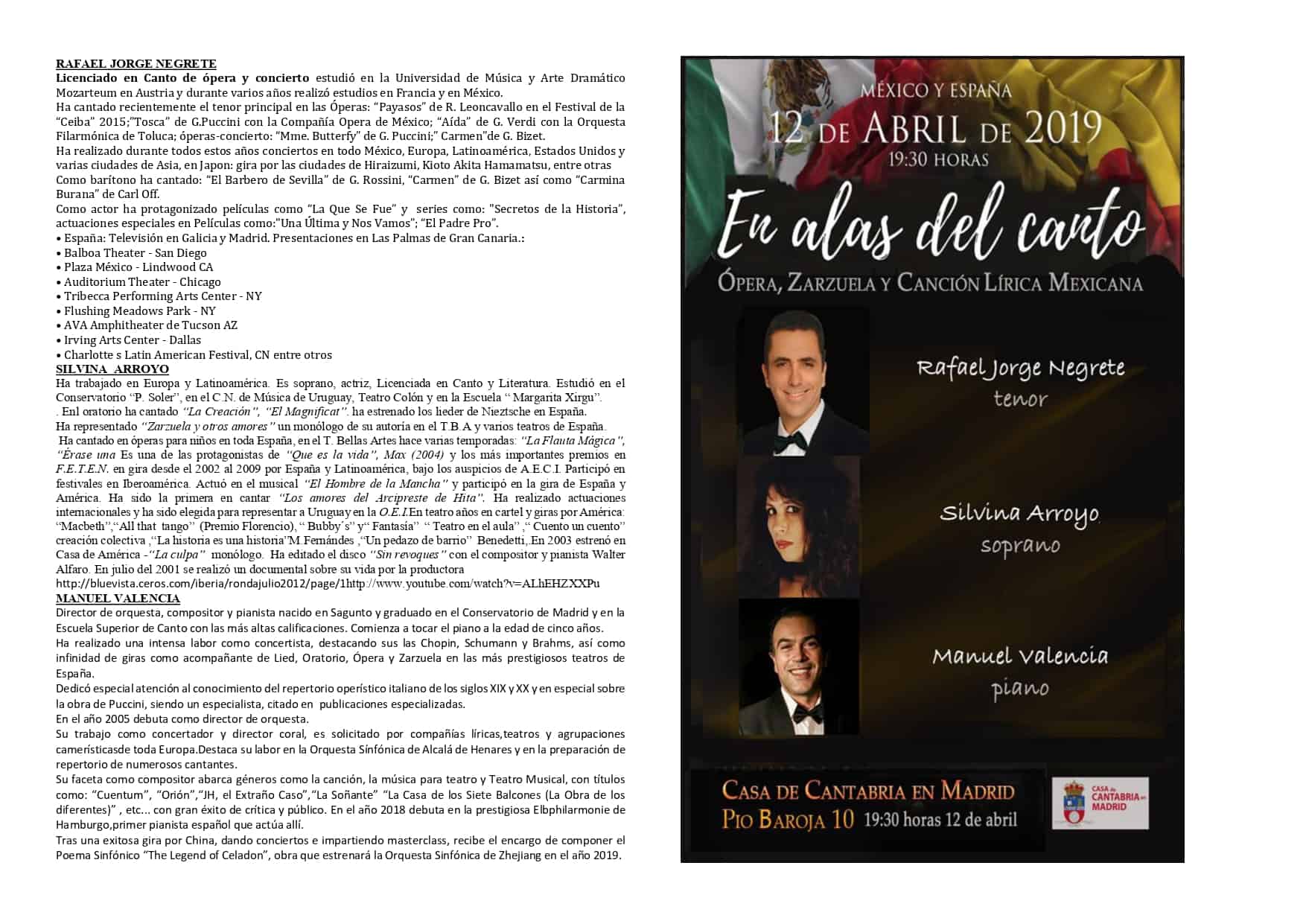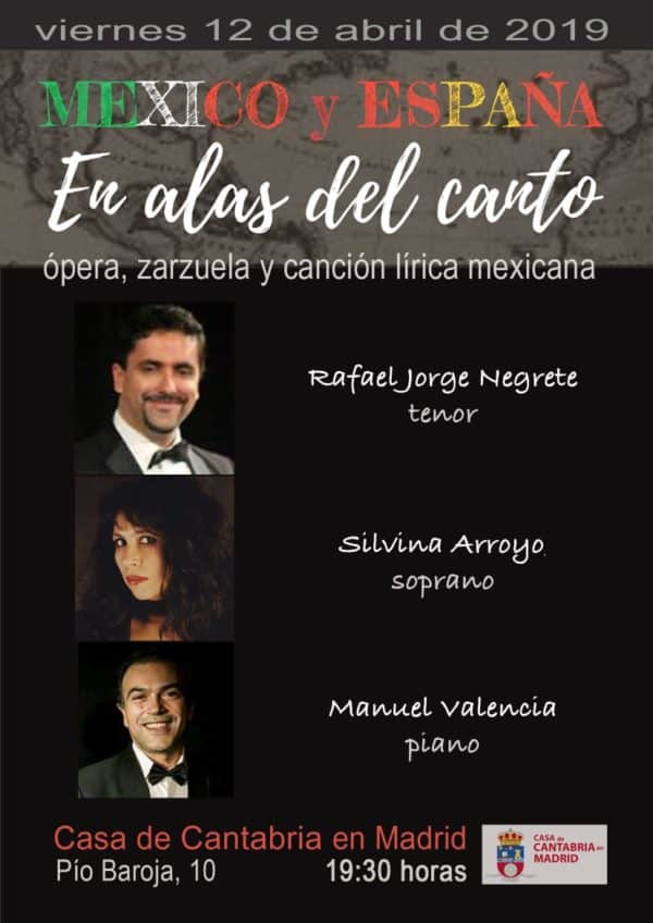 El próximo 12 de abril de 2019 a las 19:30 horas, en el Salón de Actos Severiano Ballesteros, Rafael Jorge Negrete, tenor (nieto de Jorge Negrete), Silvina Arroyo, soprano, y el maestro Manuel Valencia al piano nos deleitarán con la ópera-zarzuela-canción mexicana titulada “España y México…En las Alas del Canto”.