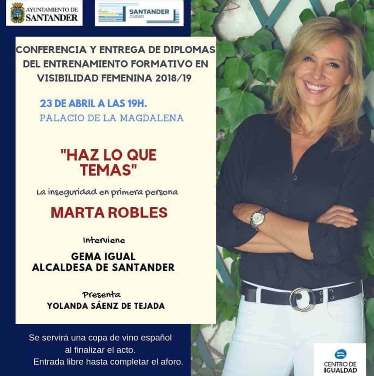 El próximo 23 de abril de 2019 a las 19:00 horas, conferencia y entrega de diplomas del entrenamiento formativo en visibilidad femenina 2018-19 en el Palacio de la Magdalena. Marta Robles impartirá la conferencia «Haz lo que temas» sobre la inseguridad en primera persona. Intervendrá la Alcaldesa de Santander Gema Igual y presentará Yolanda Saénz de Tejada.