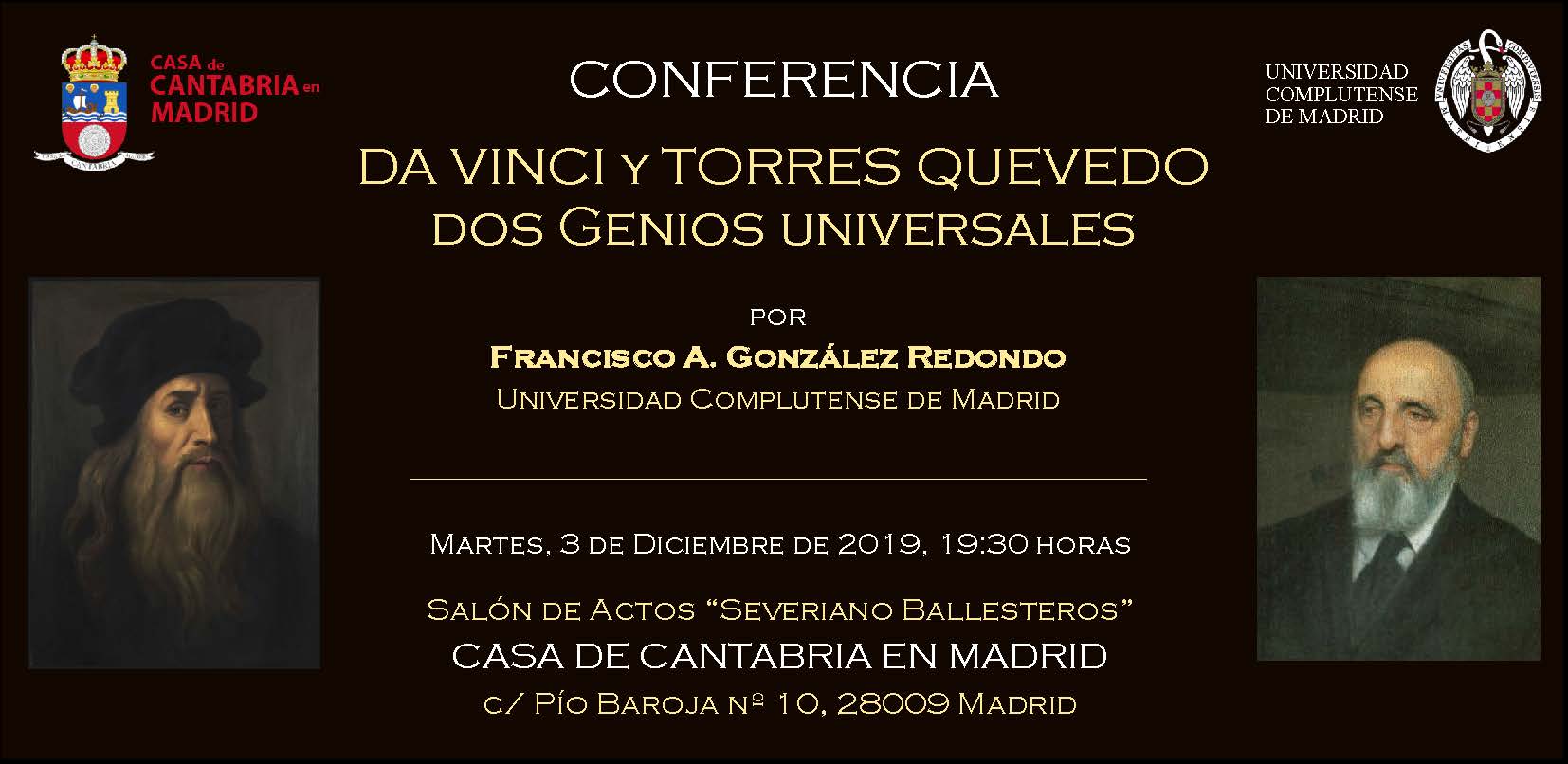 El próximo martes 3 de Diciembre a las 19:30 horas, en el Salón de Actos Severiano Ballesteros, D. Francisco A. González Redondo, Profesor Titular de Universidad, Facultad de Educación –Centro Formación de Profesorado, (Universidad Complutense de Madrid), Comisario Exposiciones Torres Quevedo, impartirá la conferencia titulada: “Da Vinci y Torres Quevedo. Dos genios universales”.