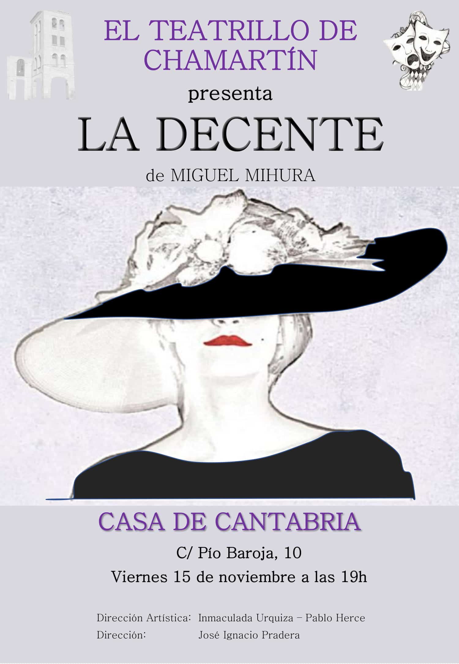 El próximo viernes 15 de Noviembre a las 19:00 horas, en el Salón de Actos Severiano Ballesteros, El Teatrillo de Chamartín, estrenará en la Casa de Cantabria en Madrid la obra “La Decente” de Miguel Mihura. Bajo la dirección artística de Inmaculada Urquiza y Pablo Herce, y Dirección de José Ignacio Pradera.