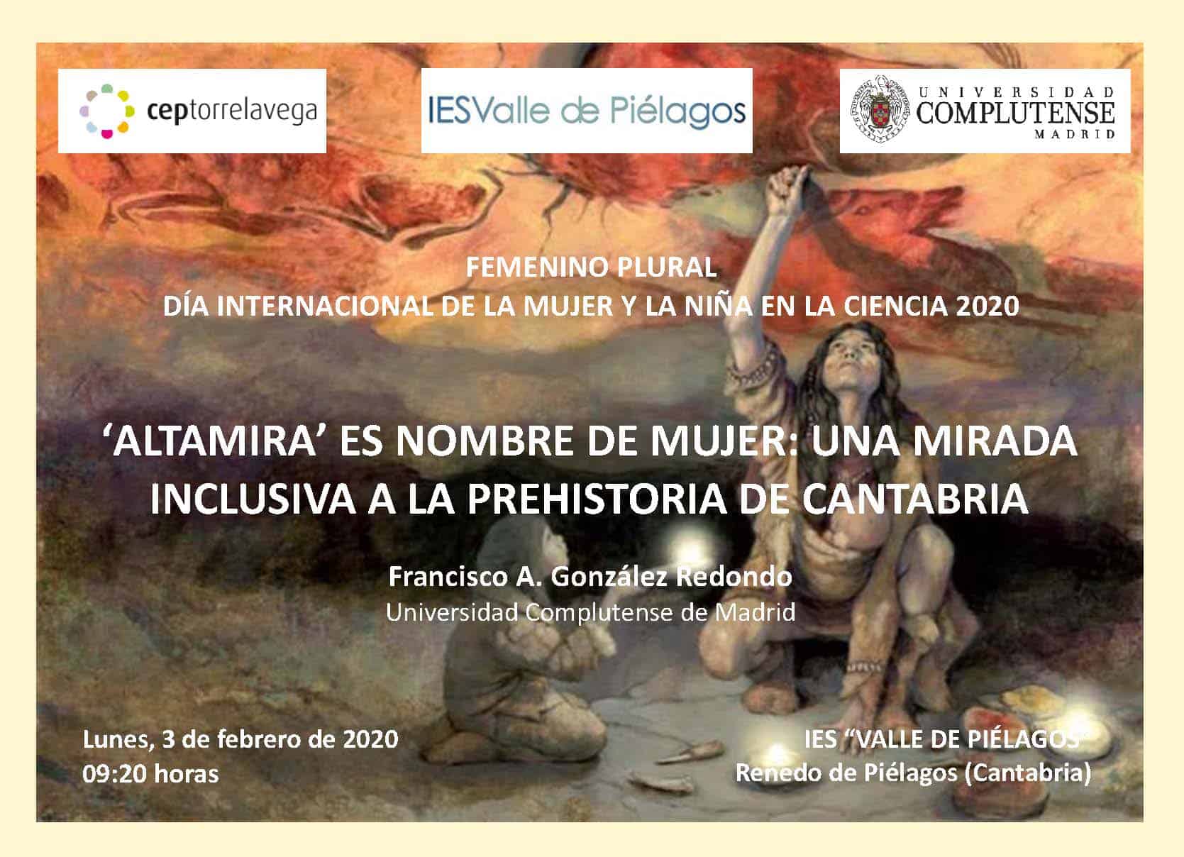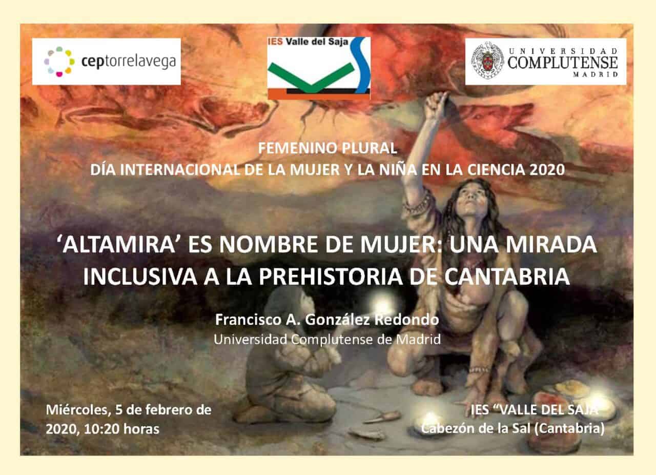 – Carteles de las Conferencias «Altamira es nombre de mujer: una mirada inclusiva a la Prehistoria de Cantabria», programadas en el IES «Valle de Piélagos» de Renedo el lunes 3 de febrero, a las 9:20 h. y en el IES «Valle del Saja» de Cabezón de la Sal (Cantabria), el miércoles 5 de febrero, a las 10:20 h., con motivo del Día Internacional de la mujer y la niña en la Ciencia 2020.