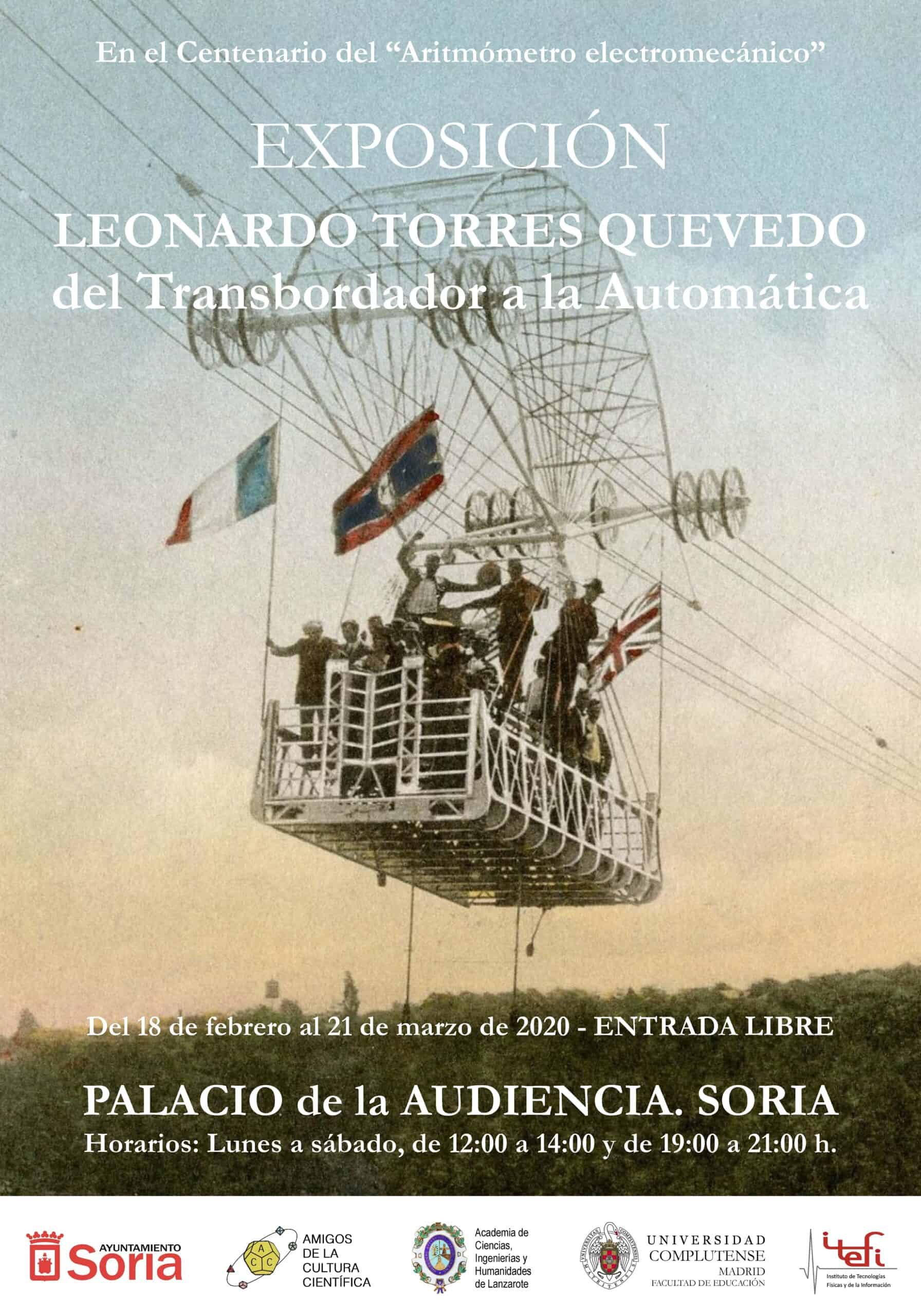 – Cartel de la Exposición «En el Centenario del Aritmómetro electromecánico. Leonardo Torres Quevedo: del Transbordador a la Automática», que inauguraremos el martes 18 de febrero, a las 19:00 h, en el Palacio de la Audiencia de Soria.