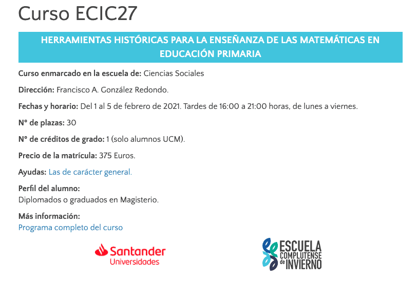 Ya está abierto el plazo de matrícula del Curso : «Herramientas históricas para la enseñanza de las matemáticas en Educación Primaria», que se impartirá del 1 al 5 de febrero de 2021, de 16:00 a 21:00 horas, organizado por la Escuela de Invierno de la Universidad Complutense de Madrid. La dirección corre a cargo del gran colaborador de la Casa de Cantabria en Madrid D. Francisco A. González Redondo, Dr. Matemáticas, Dr. Filosofía, Profesor de Historia de la Ciencia en la Universidad Complutense de Madrid.