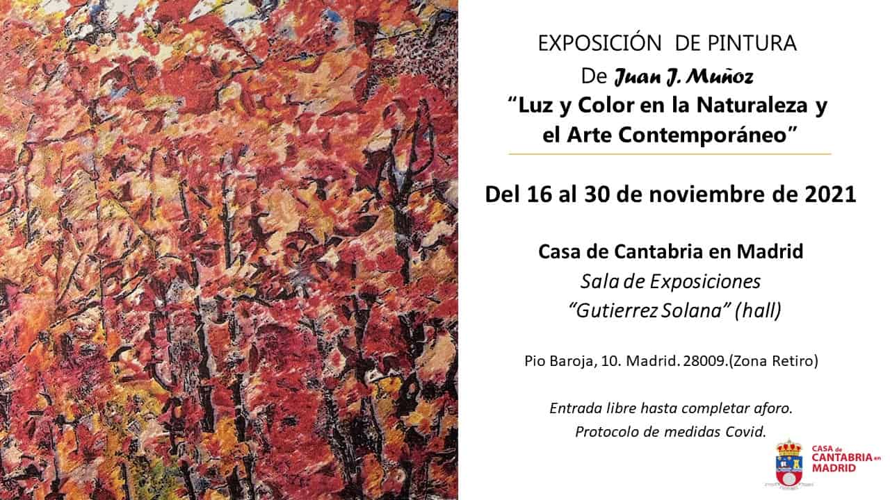 El 16 de noviembre de 2021, a las 19:00 horas, en la sala de exposiciones Gutiérrez Solana, hall, de la Casa de Cantabria en Madrid, se inaugurará la muestra pictórica de Juan J. Muñoz titulada “Luz y Color en la Naturaleza y el Arte Contemporáneo”.