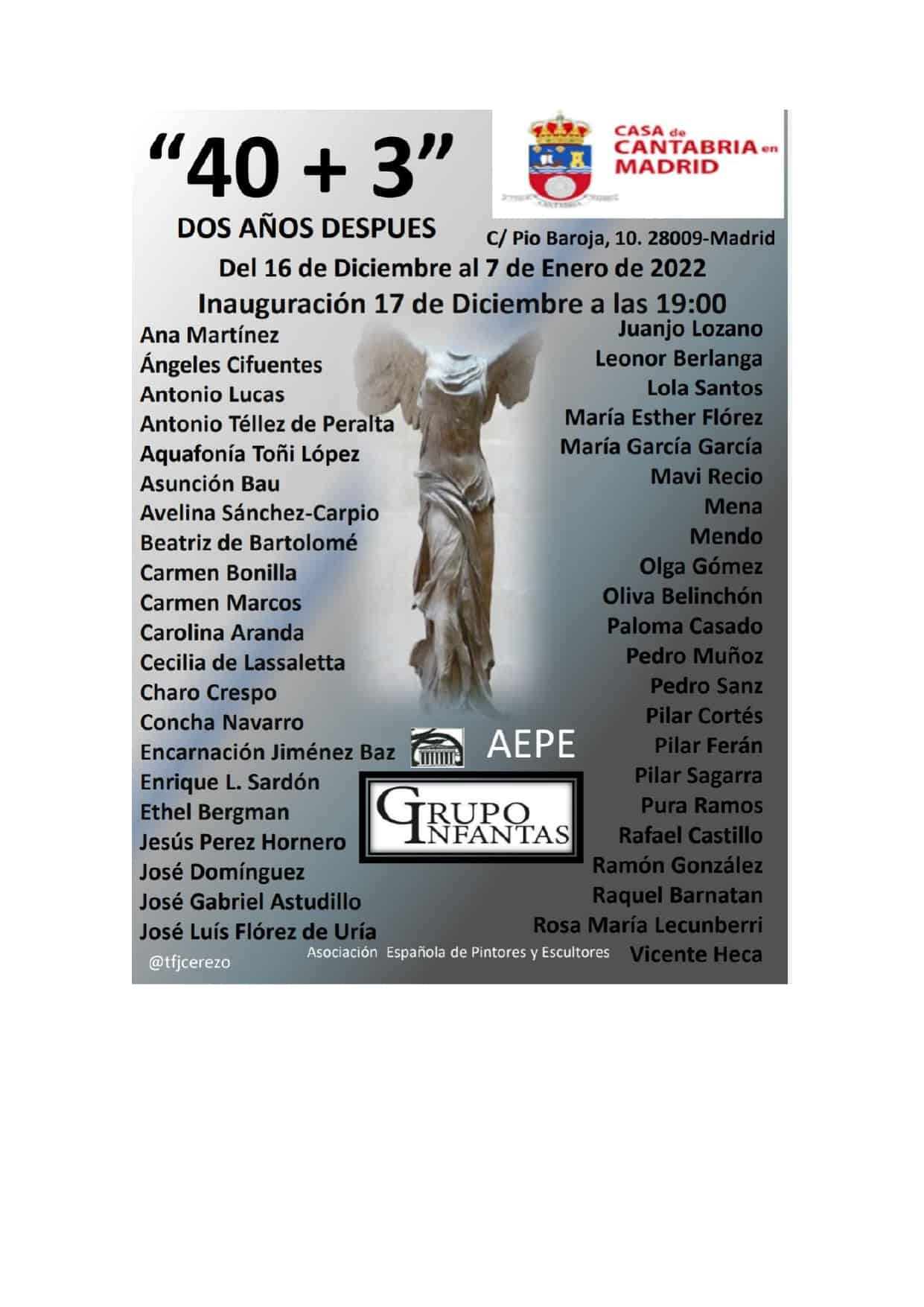 El viernes, 17 de diciembre de 2021, a las 19:00 horas, en la Sala Gutiérrez Solana, hall, se inaugurará la exposición colectiva “40+3”, que reúne obras de los siguientes artistas: Ana Martínez, Ángeles Cifuentes, Antonio Lucas, Antonio Téllez de Peralta, Aquafonía Toñi López, Asunción Bau, Avelina Sánchez-Carpio, Beatriz de Bartolomé, Carmen Bonilla, Carmen Marcos, Carolina Aranda, Cecilia de Lassaletta, Charo Crespo, Concha Navarro, Encarnación Jiménez Baz, Enrique L. Sardón, Ethel Bergman, Jesús Pérez Hornero, José Domínguez, Jose Gabriel Astudillo, Jose Luis Flórez de Uría, Juanjo Lozano, Leonor Berlanga, Lola Santos, María Esther Flórez, María García García, Mavi Recio, Mena, Mendo, Olga Gómez, Oliva Belinchón, Paloma Casado, Pedro Muñoz, Pedro Sanz, Pilar Cortés, Pilar Ferán, Pilar Sagarra, Pura Ramos, Rafael Castillo, Ramón González, Raquel Barnatan, Rosa María Lecunberri, Vicente Heca.