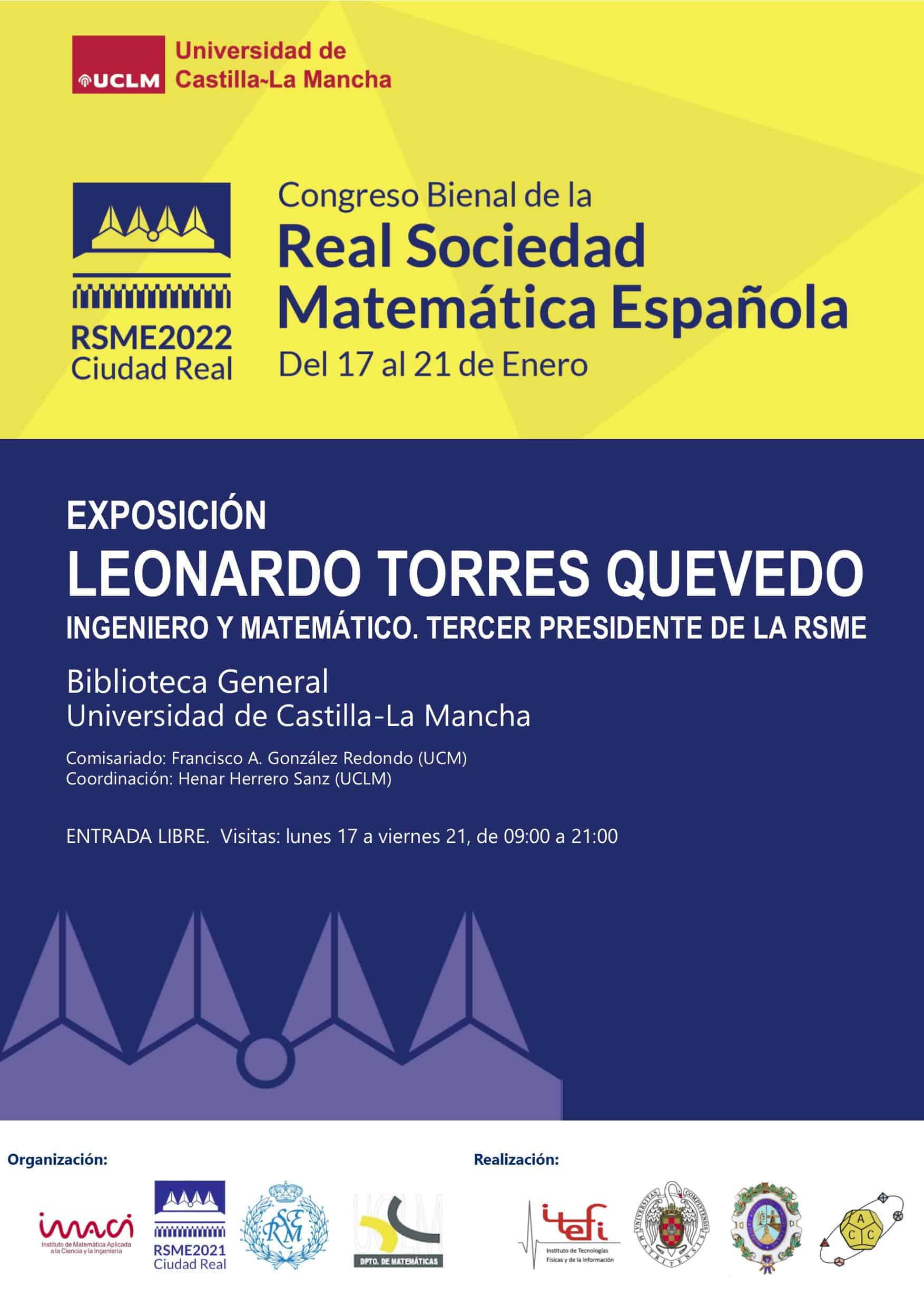 Dos líneas para informarte de que, en el marco del Congreso Bienal RSME2022, organizado por la Real Sociedad Matemática Española en Ciudad Real, Bienvenida | Real Sociedad Matemática Española (bienalrsme.com), entre el lunes 17 y el viernes 21 de enero podrá visitarse la exposición «Leonardo Torres Quevedo: ingeniero y matemático, tercer Presidente de la RSME» en la Biblioteca Central de la Universidad de Castilla-La Mancha: triptico.pdf (bienalrsme.com)