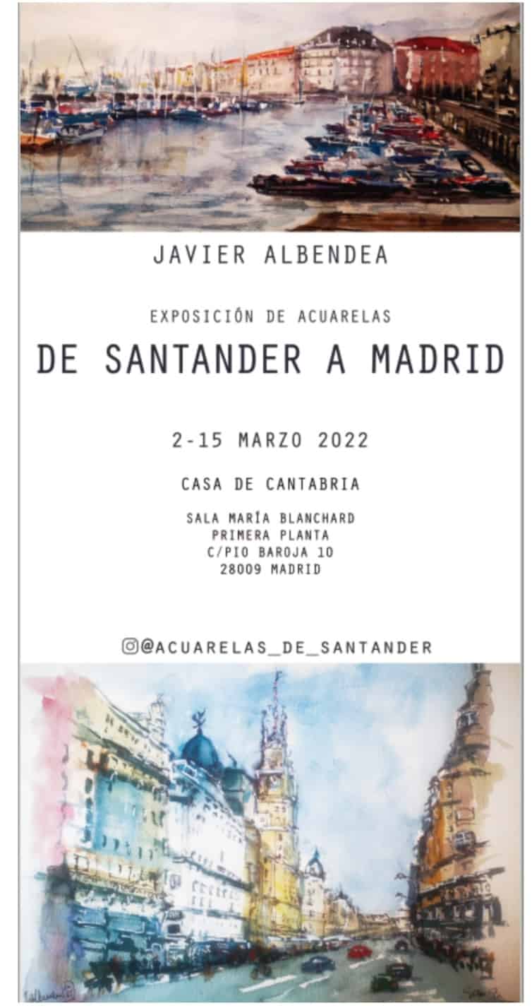 Del 2 al 15 de marzo de 2022, en la sala de exposiciones “María Blanchard”, primera planta de la Casa de Cantabria en Madrid, se expondrá la colección del acuarelista cántabro Javier Albendea bajo el título “De Santander a Madrid”.