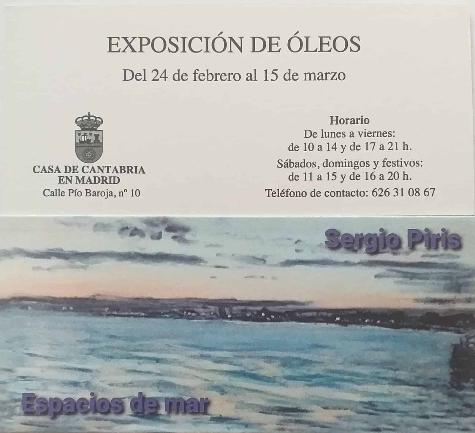 El jueves 24 de febrero de 2022 se inaugurará la exposición de pinturas de oleos de Sergio Piris titulada “Espacios de Mar”. Se trata de una nueva muestra con indudable sabor cántabro con la que el artista santanderino nos vuelve a transportar al Cantábrico.