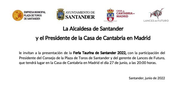Santander presenta el 27 de junio en la Casa de Cantabria en Madrid su gran feria taurina Santiago 2022, una ocasión única para disfrutar de cinco corridas de toros, una de rejones y una novillada entre el 23 y el 29 de julio en la plaza de toros de Cuatro Caminos.
