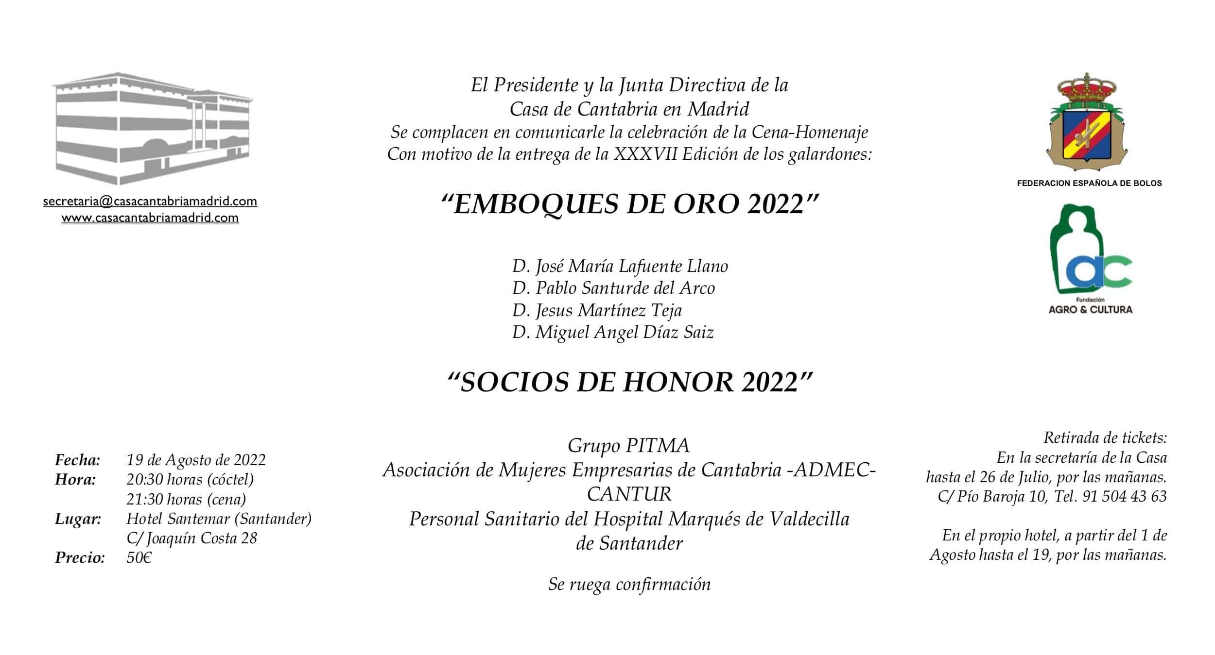 El próximo día 19 de Agosto en el Hotel Santemar de Santander tendrá lugar la entrega de la XXXVIII Edición de los galardones: “Emboques de Oro 2022” y “ Socios de Honor 2022”