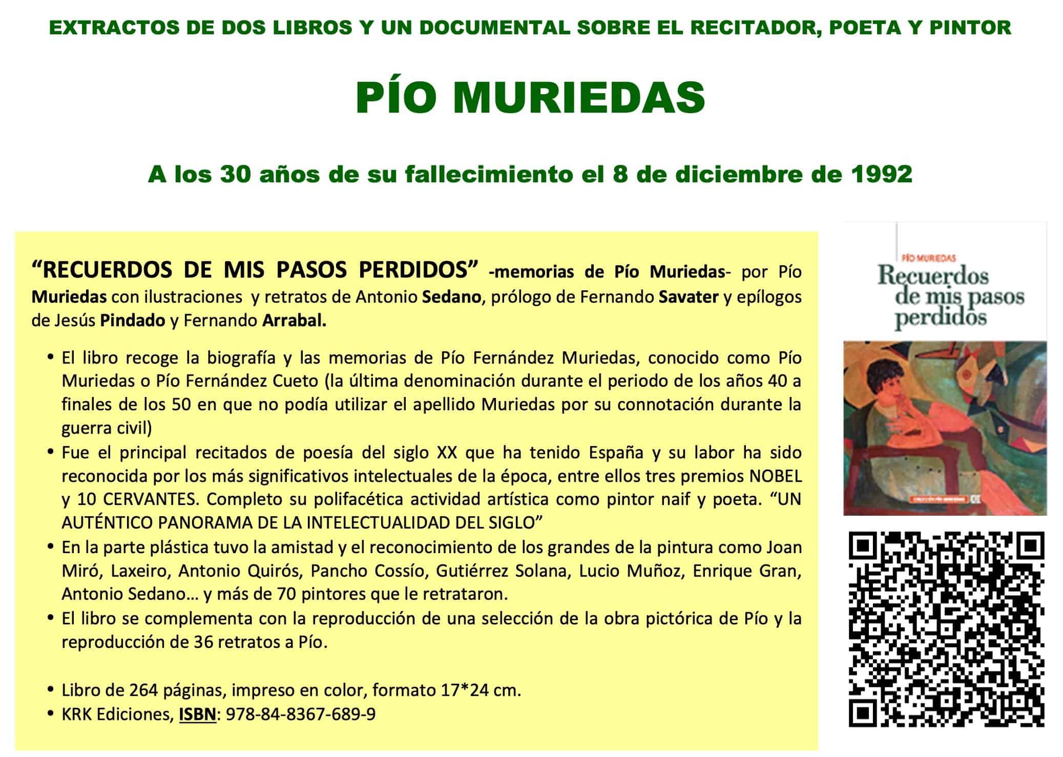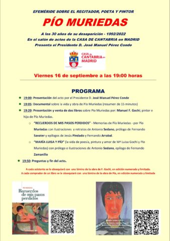 El próximo viernes 16 de septiembre, a las 19:00 horas en el Salón de actos Severiano Ballesteros de la Casa de Cantabria en Madrid, tendrá lugar la presentación del documental sobre la vida y obra de Pío Muriedas, junto a la presentación de los libros” Recuerdos de mis pasos perdidos” y “ María Luisa y Pío” por Manuel F. Gochi pintor e hijo de Pío Muriedas. Les esperamos a todos en esta gran presentación.