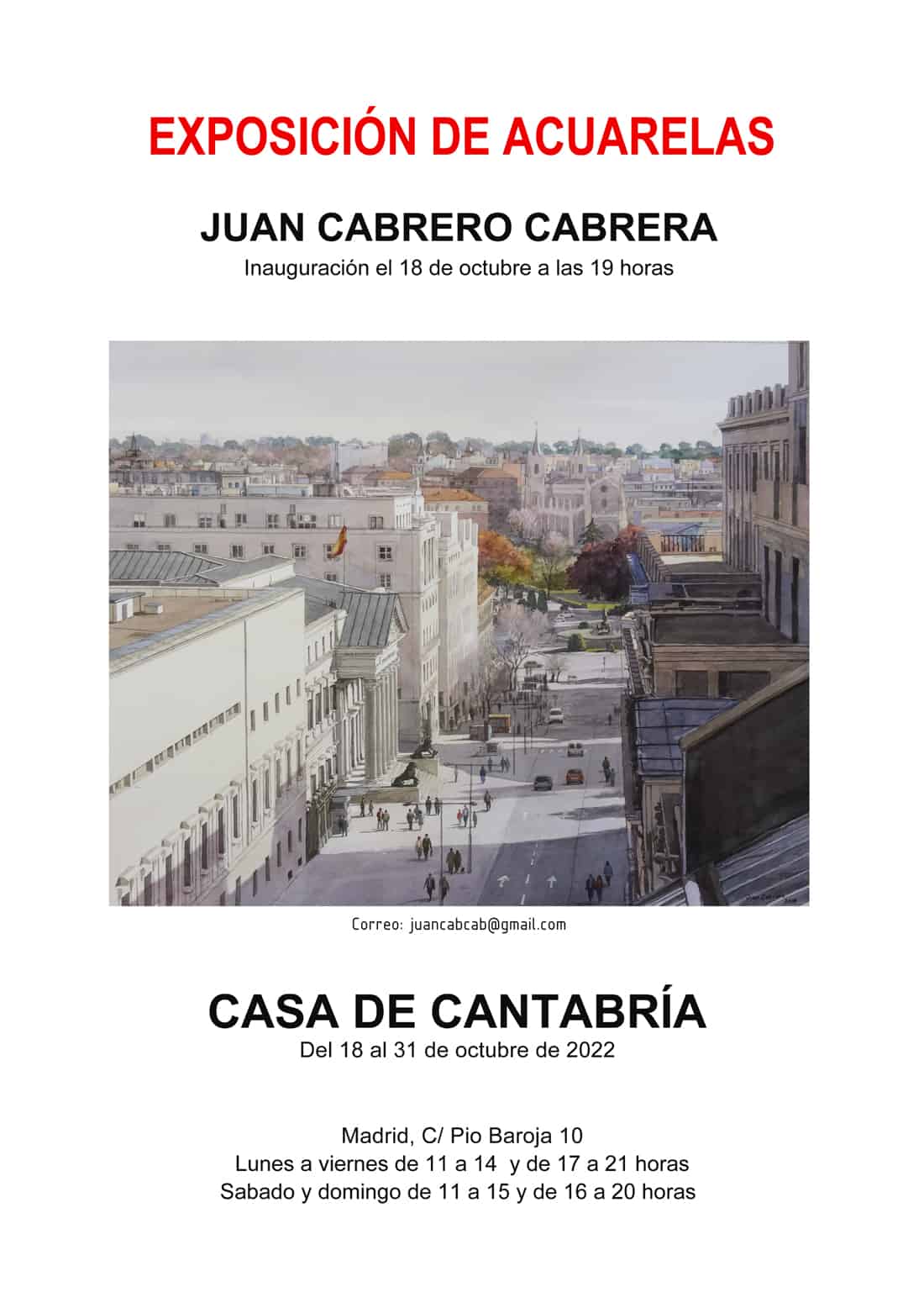 Del 16 al 31 de Octubre, la Sala de exposiciones Gutierrez Solana (Hall) de la Casa de Cantabria en Madrid, acoge la exposición de Acuarelas y Óleos del pintor Juan Cabrero Cabrera . Este artista se guía por cuatro principios: el orden, el método, la unidad y la armonía. En su observación del mundo, ha elegido un aspecto esencial de la naturaleza para presentárnosla con sus propios ojos, con una mirada de artista.