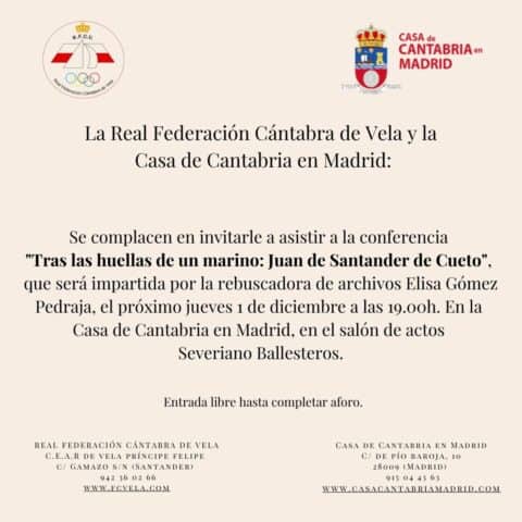 El próximo jueves, 1 de Diciembre en el Salón de Actos Severiano Ballesteros de la Casa de Cantabria en Madrid a las 19:00 horas, tendrá lugar la conferencia “ Tras las huellas de un marino: Juan de Santander de Cueto” impartida por Elisa Gómez Pedraja. Les esperamos a todos en esta maravillosa conferencia.