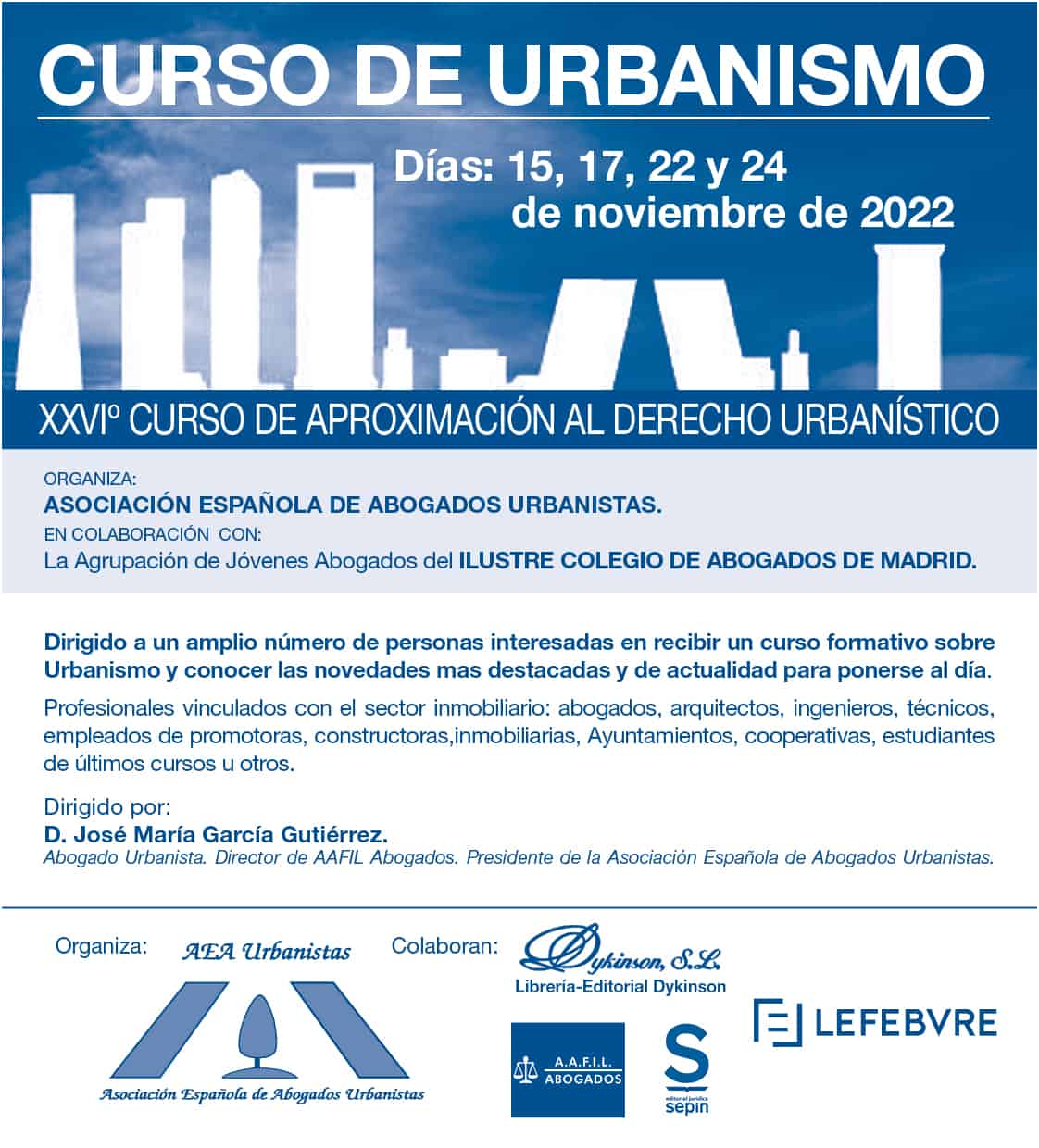 Los días 15,17,22 y 24 de noviembre tendrá lugar en el Salón de actos Severiano Ballesteros el XXVI Curso de aproximación al Derecho Urbanístico.