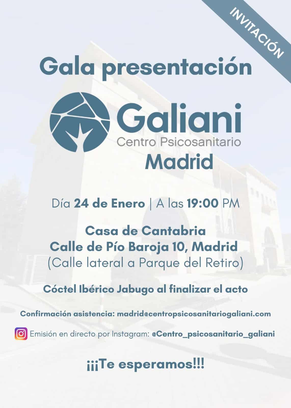 El próximo 24 de enero a las 19:00 horas en el Salón de Actos Severiano Ballesteros tendrá lugar la Gala presentación Galiani Centro Psicosanitario Madrid.