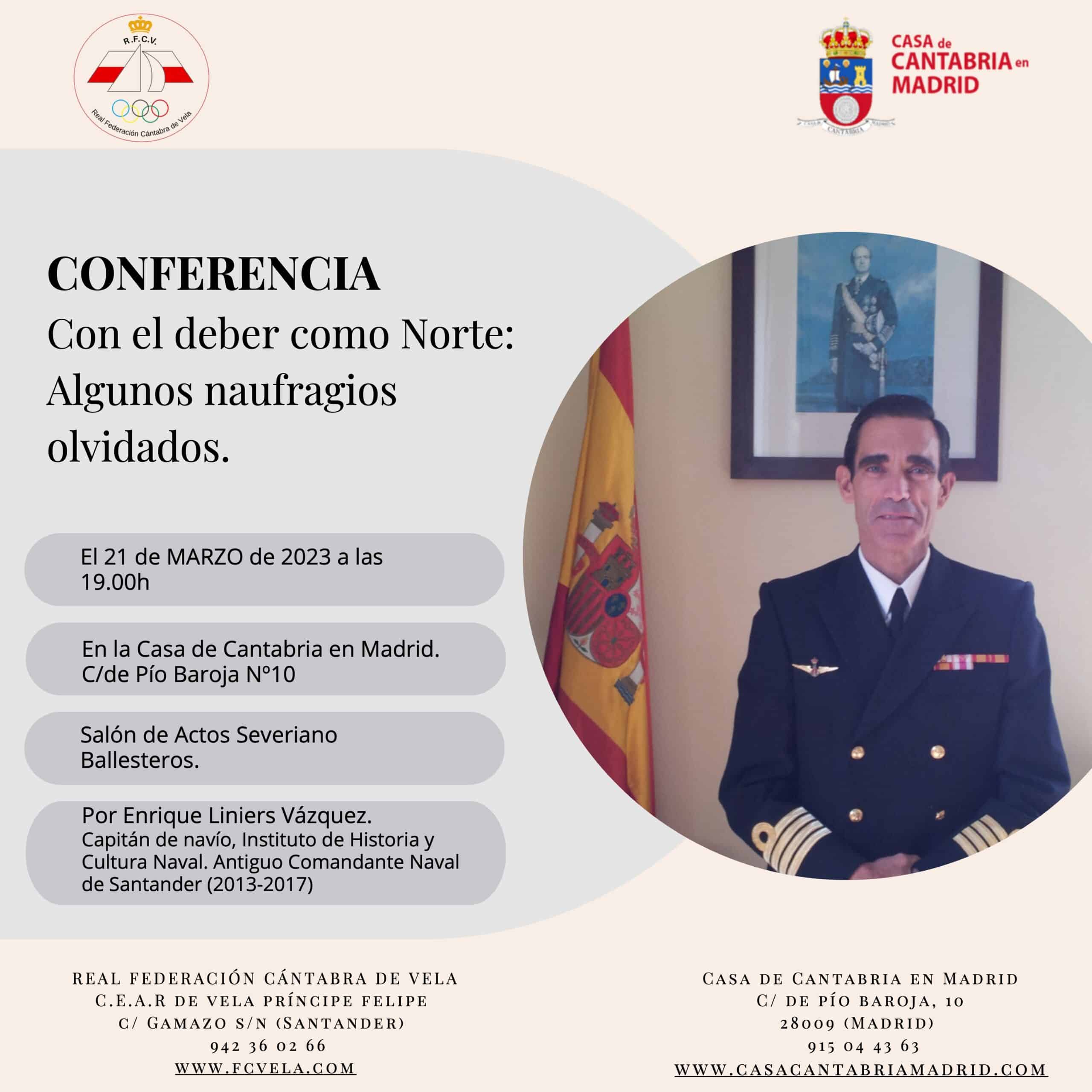 El próximo martes 18 de abril a las 19:00 horas, tendrá lugar en el Salón de Actos Severiano Ballesteros la Conferencia CON EL DEBER COMO NORTE: ALGUNOS NAUFRAGIOS OLVIDADOS, por el Capitán de Navío D. Enrique Liniers Vázquez.