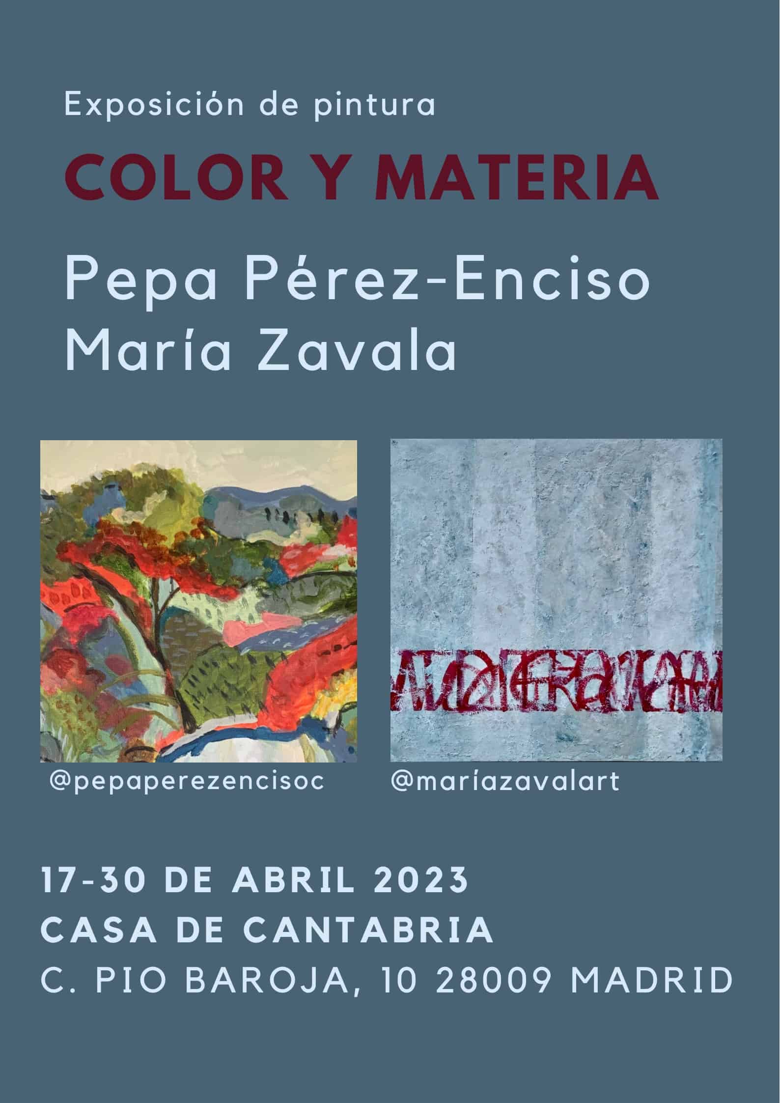 La sala de exposiciones Maria Blanchard 1ª planta, acogerá del 17 a 30 de abril la exposición de las pintoras Pepa Pérez-Enciso y Maria Zavala, con el nombre de “Pigmentos y Materia”.