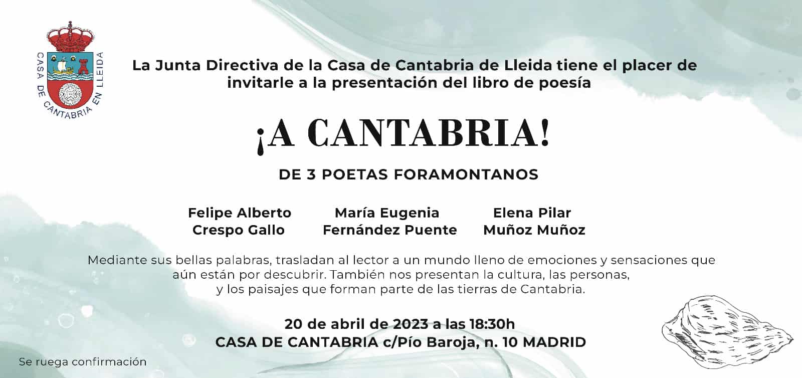 La Casa de Cantabria en Lerida, presenta en el Salón de actos Severiano Ballesteros-Ataúlfo Argenta a las 18:30 horas, el libro de poesía, ¡ A Cantabria!, por tres poetas Foramontanos, Felipe Alberto Crespo Gallo, María Eugenia Fernández Puente y Elena Pilar Muñoz Muñoz.