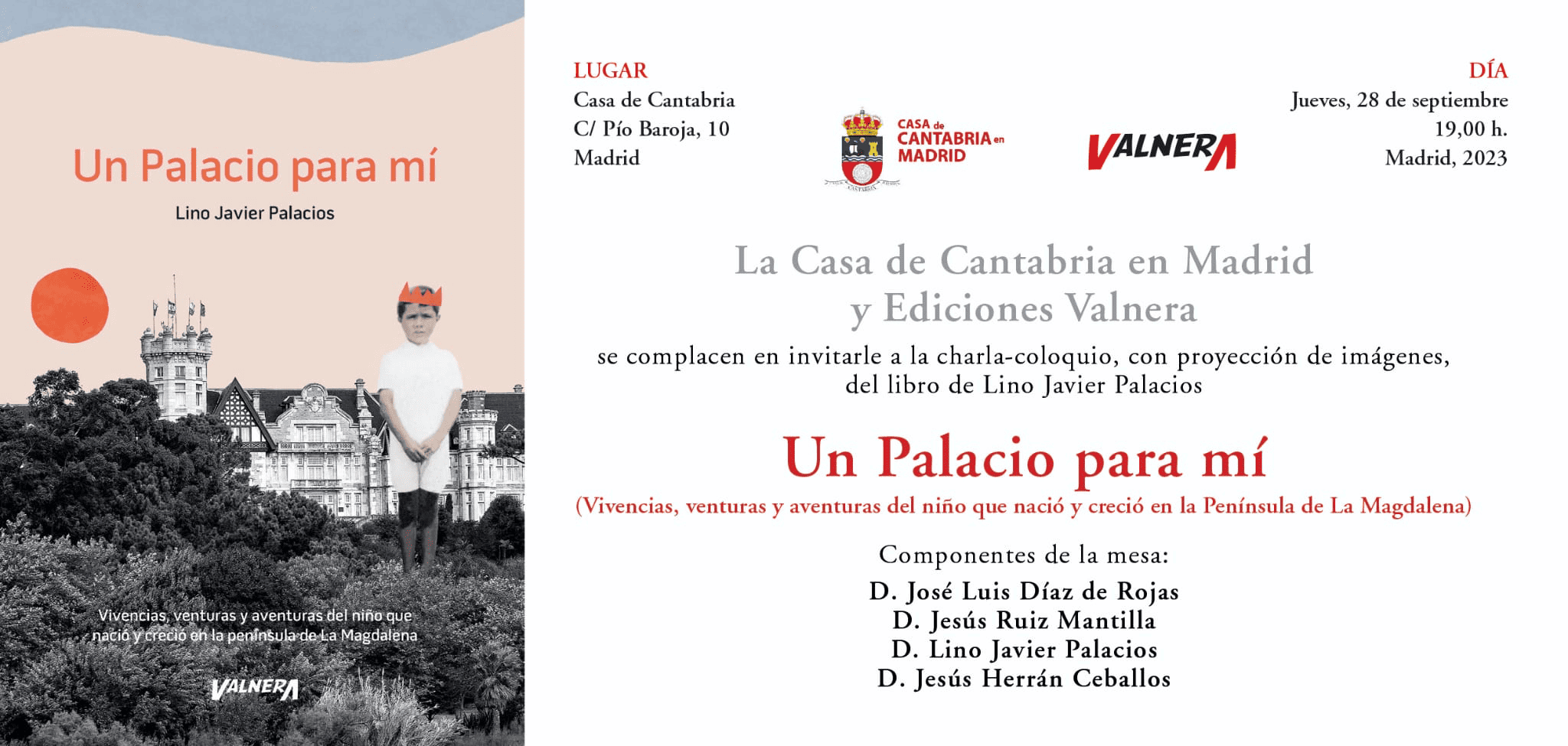 El próximo jueves 28 de septiembre a las 19:00 horas tendrá lugar en el Salón de actos Severiano Ballesteros de la Casa de Cantabria en Madrid la presentación del libro de Lino Javier Palacios “ Un palacio para mi”.