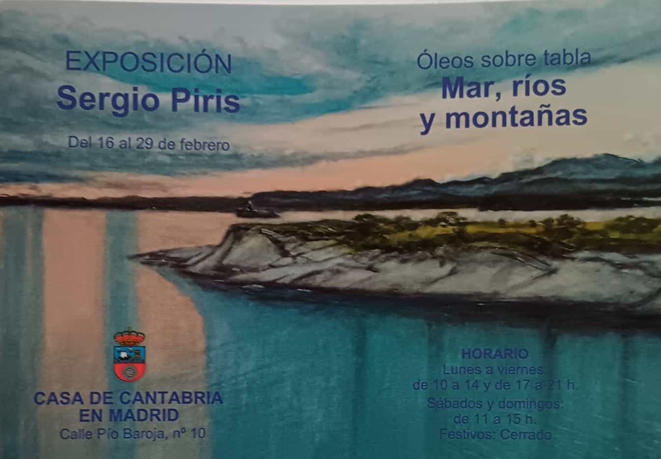 La Sala de exposiciones Gutiérrez Solana ( Hall) de la Casa de Cantabria en Madrid acogerá del 16 al 29 de febrero la exposición de óleos sobre tabla “Mar, ríos y montañas” del prestigioso pintor cántabro D. Sergio Piris asiduo de nuestra Casa desde hace muchos años.