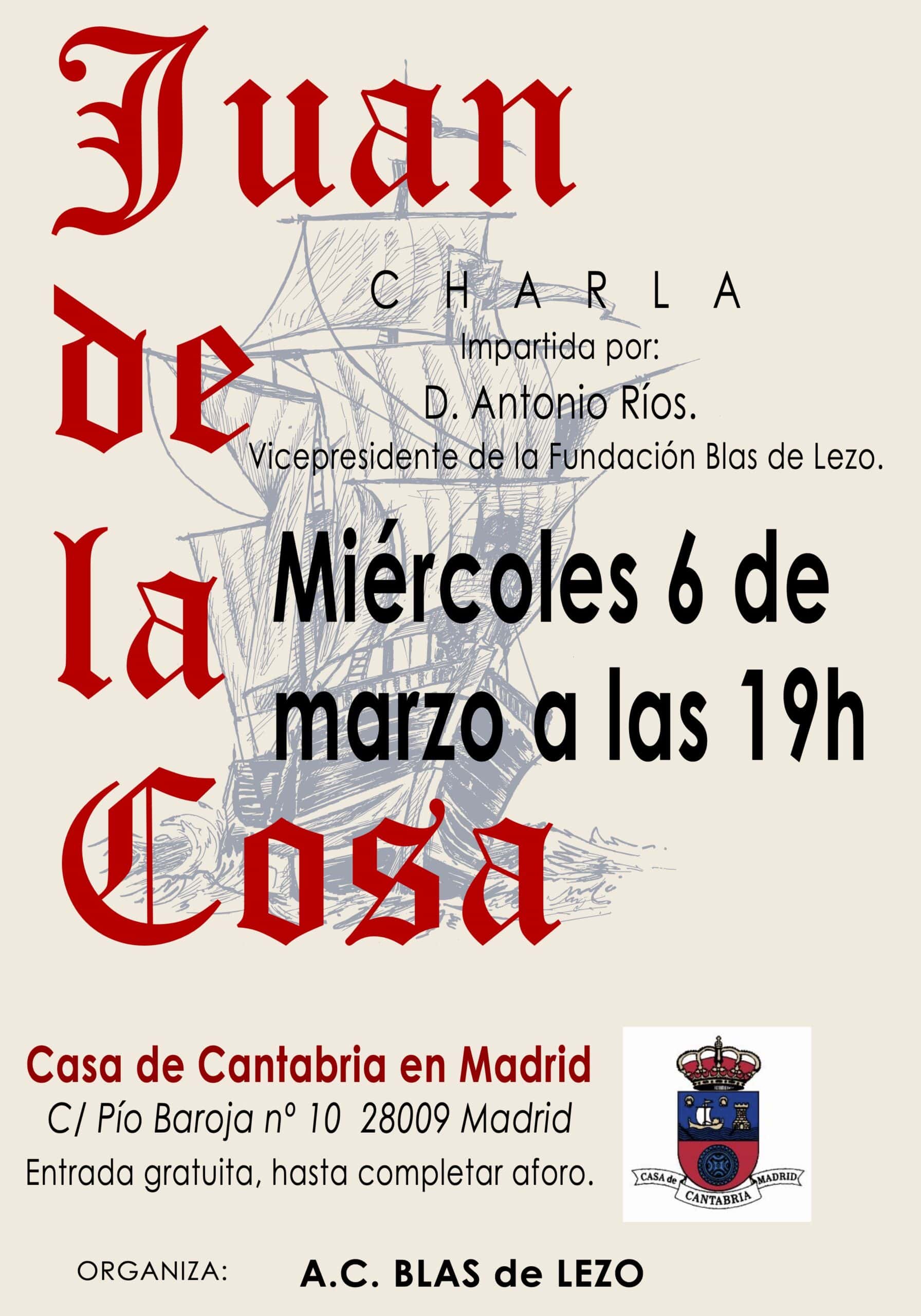 El miércoles 6 de marzo a las 19:00 horas en el Salón de actos Severiano Ballesteros- Ataúlfo Argenta, tendrá lugar la conferencia“Juan de la Cosa, comerciante, Navegante, Piloto, Cartógrafo, Explorador, Espía…” El hombre que dibujó el primer mapamundi fue un español, nacido en Cantabria, en el siglo XV, Juan de la Cosa que además participo en el descubrimiento de América y fue uno de los primeros en explorar la costa oeste del nuevo continente.