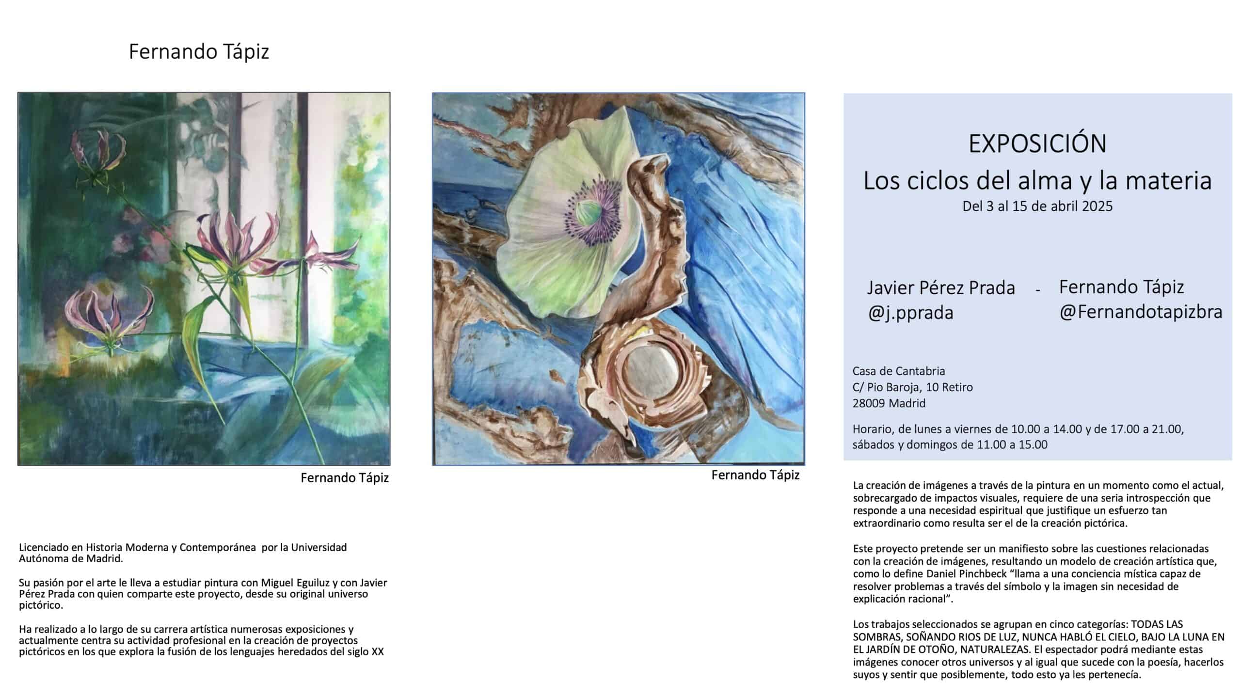 Del 3 a 15 de abril, la sala María Blanchard acoge la exposición conjunta «Los ciclos del alma y la materia», una muestra que reúne la obra de los artistas Javier Pérez Prada y Fernando Tapiz.