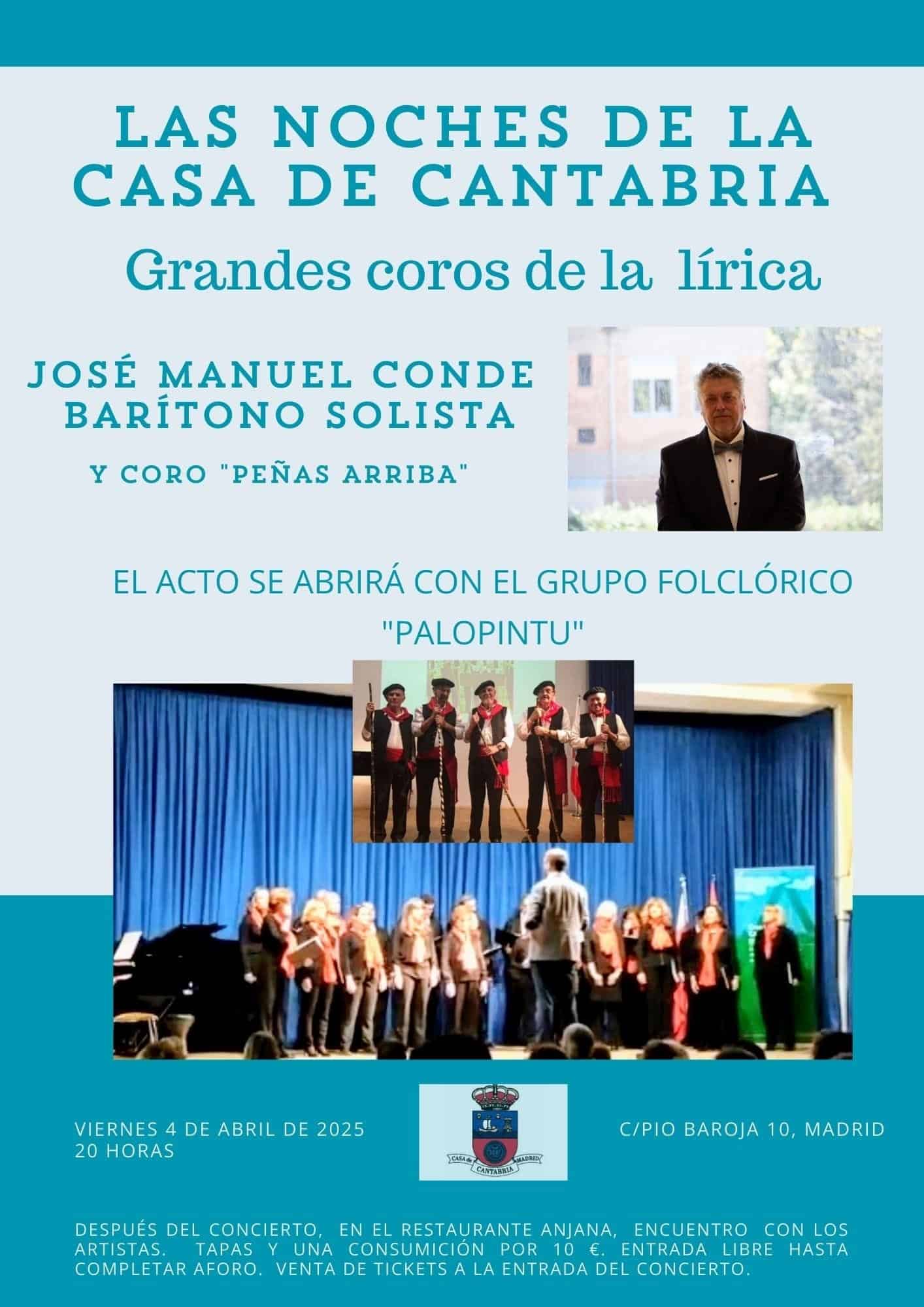 El próximo viernes 4 de abril de 2025 a las 20:00 horas en el salón de actos Severiano Ballesteros-Ataúlfo Argenta tendrá lugar el quinto y último evento de laI Jornada Musical de las «Noches de la Casa de Cantabria», en esta ocasión el coro “Peñas arriba” junto con el barítono solista y presidente de la Casa de Cantabria, José Manuel Conde, nos deleitarán con un concierto de clausura muy especial de variado repertorio, esta vez nuestra querida agrupación folklórica“Palopintu” se encargará de abrir el acto.