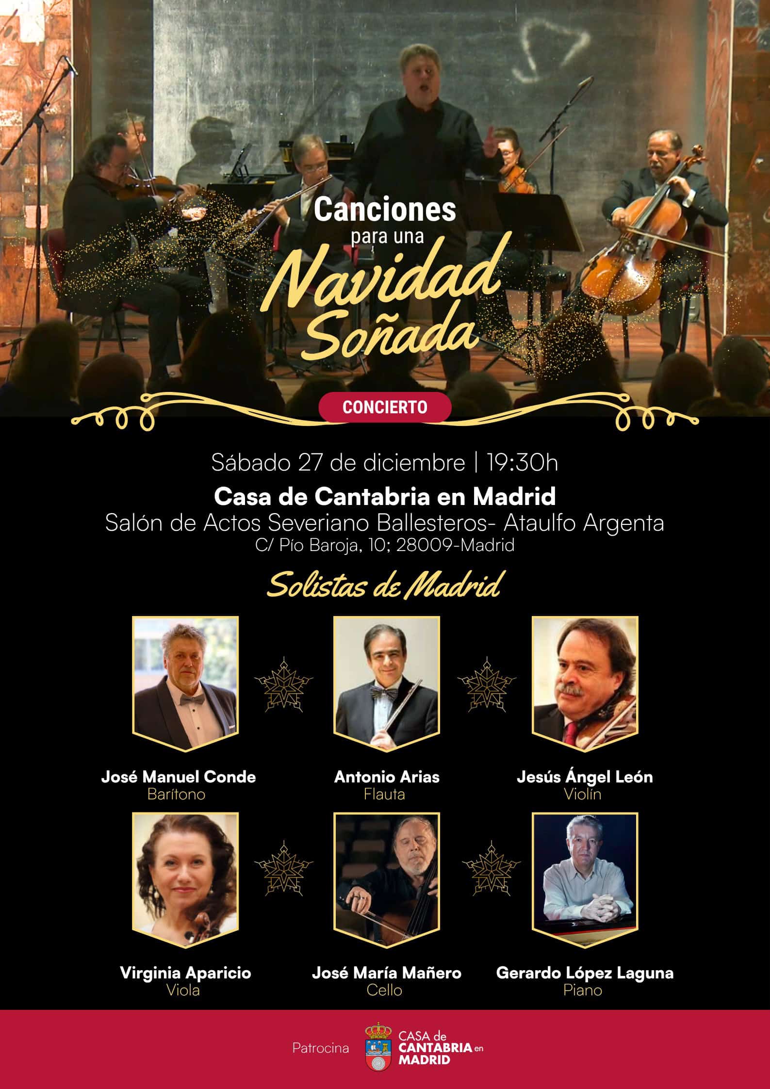 El próximo 27 de diciembre, a las 19:30 horas, el Salón de Actos Severiano Ballesteros–Ataúlfo Argenta será escenario del concierto “Canciones para una Navidad Soñada”, una propuesta musical que reúne a destacados solistas de Madrid: José Manuel Conde (barítono), Antonio Arias (flauta), Jesús Ángel León (violín), Virginia Aparicio (viola), José María Mañero (cello) y Gerardo López Laguna (piano).