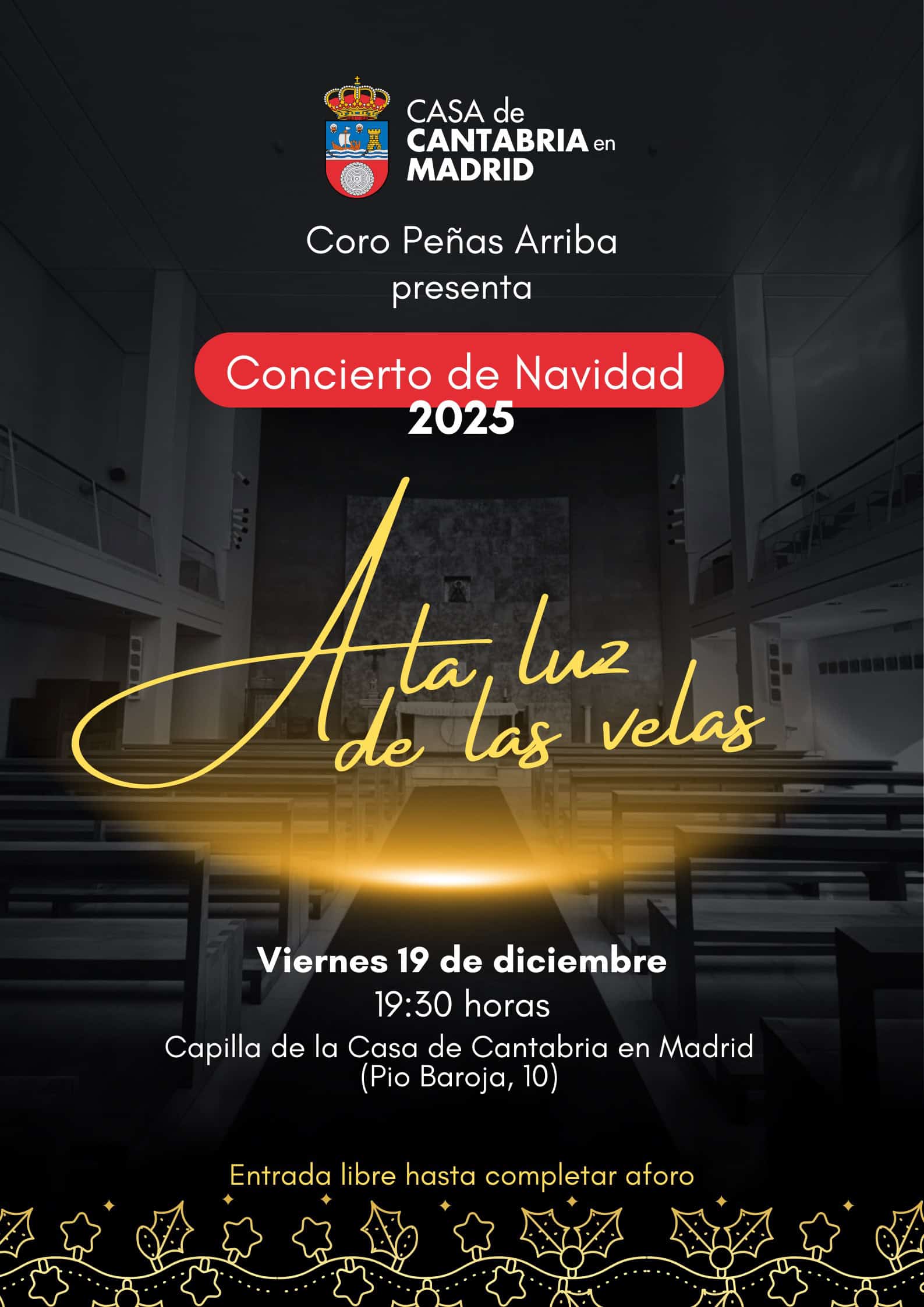 El próximo 19 de diciembre, a las 19:30 horas, la Capilla de la Casa de Cantabria en Madrid acogerá el tradicional Concierto de Navidad del Coro Peñas Arriba, una de las citas más esperadas de nuestro calendario cultural.