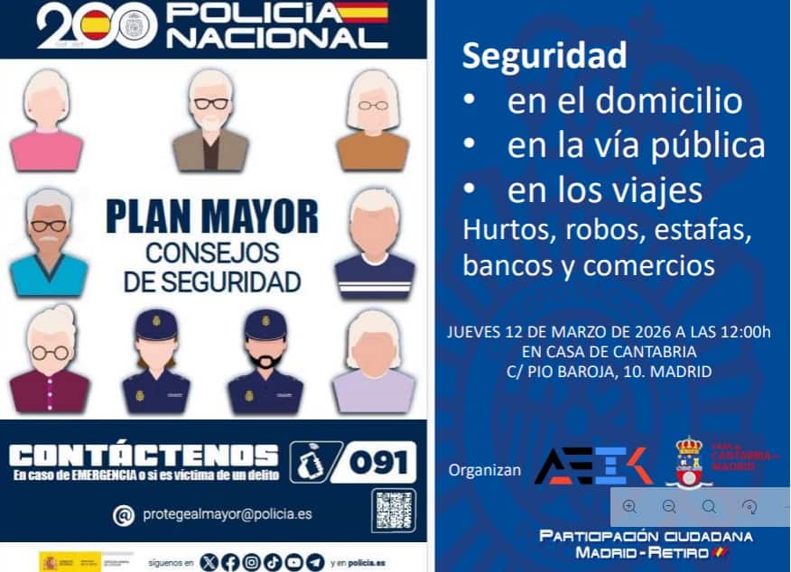 El jueves 12 de marzo a las 12:00 horas celebraremos la conferencia «Plan Mayor: Consejos de Seguridad». Esta sesión informativa ha sido organizada gracias a la colaboración estratégica entre la Asociación de Eméritos IBM y Kyndryl, nuestra Casa de Cantabria y el equipo de Participación Ciudadana de la Policía Nacional de la zona Madrid-Retiro.