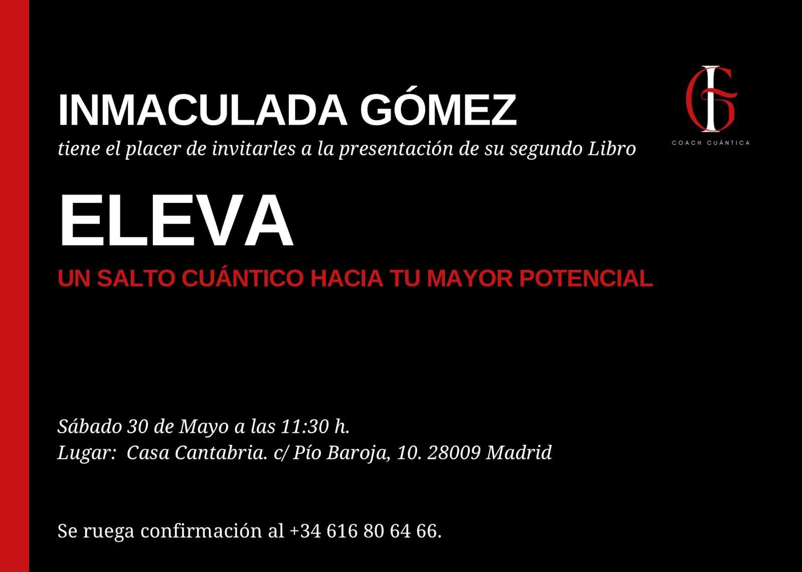 La Casa de Cantabria en Madrid acogerá el próximo sábado 30 de mayo a las 11:30 h la presentación de «Eleva tu vida. Un salto cuántico hacia tu mayor potencial», el segundo libro de la escritora, motivadora y conferenciante Inmaculada Gómez.