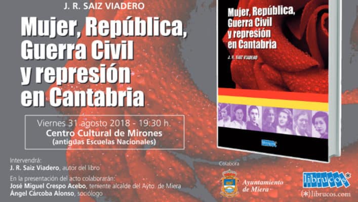 El escritor y periodista José Ramón Saiz Viadero presentará su último libro, Mujer, República, Guerra Civil y represión en Cantabria (editorial Librucos), a las 19:30 horas de este viernes, 31 de agosto, en el Centro Cultural (antiguas Escuelas Nacionales) del pueblo de Mirones, en el municipio de Miera. Además de Saiz Viadero, en el acto intervendrán el sociólogo Ángel Cárcoba y el teniente de alcalde del Ayuntamiento de Miera, José Miguel Crespo.