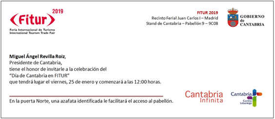 Desde la Casa de Cantabria en Madrid nos complace remitirles invitación a la Feria Internacional de Turismo -FITUR 2019- (International Tourism Trade Fair) para la celebración del ”Día de Cantabria” que se llevará a cabo el 25 de enero, viernes, a las 12:00 horas en el Stand de Cantabria de la Feria Internacional de Turismo FITUR (Madrid – IFEMA –Recinto Ferial Juan Carlos I, Puerta Norte – Pabellón 9 – Stand 9C08).