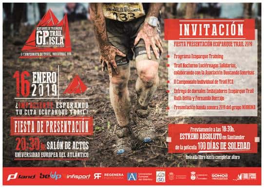 Estimados amigos del Ecoparque, muy pronto estaremos otra vez viviendo un gran fin de semana de deporte con el Ecoparque TRail GP Isla que será el 3 de marzo. Esta tarde a las 20:30 h. presentamos todas las novedades de esta sexta edición en el Salón de Actos de la Universidad Europea del Atlántico, y un poco antes a las 18:30 tendremos el estreno en Cantabria de la película «100 días de soledad». Finalizamos con el micro concierto de MINNIMA y su tema «Voluntad» que es banda sonora de la carrera. Más información en la invitación.