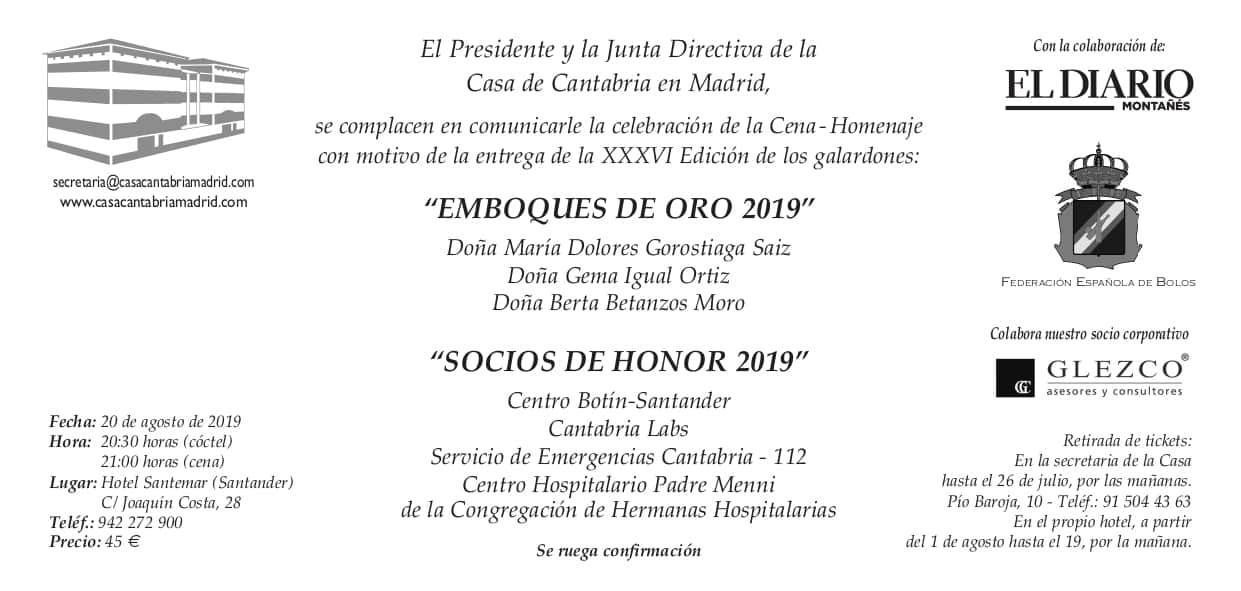 Por motivos organizativos rogamos contacten con Secretaría para confirmar su asistencia hasta la fecha indicada. Teléfono de contacto 673 85 42 85. Si lo prefieren pueden dejar enviado un email a secretaria@casacantabriamadrid.com.